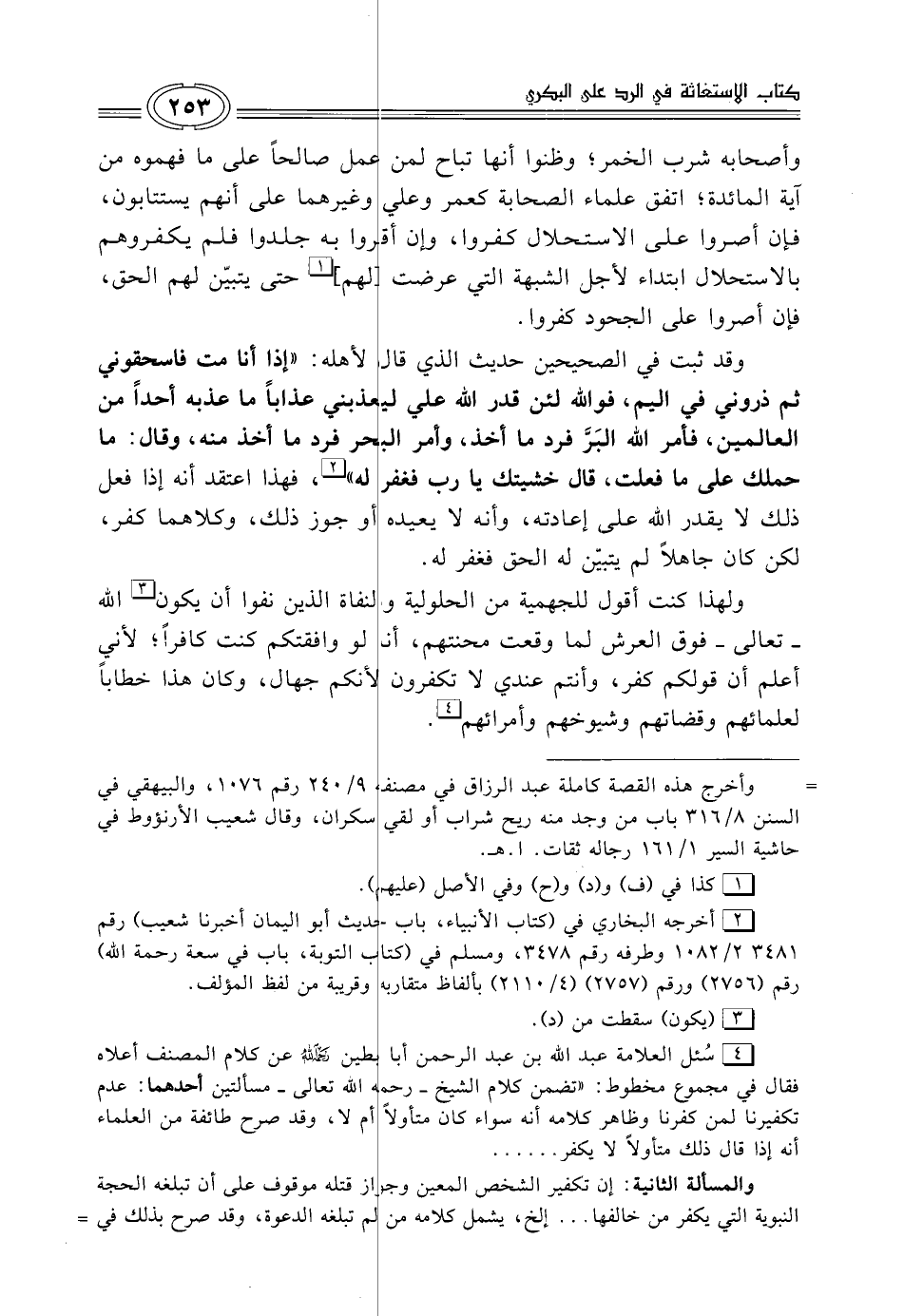 (¬4) سُئل العلامة عبد الله بن عبد الرحمن أبا بطين -رحمه الله- عن كلام المصنف أعلاه فقال في مجموع مخطوط: "تضمن كلام الشيخ -رحمه الله تعالى- مسألتين أحدهما: عدم تكفيرنا لمن كفرنا وظاهر كلامه أنه سواء كان متأولاً أم لا، وقد صرح طائفة من العلماء أنه إذا قال ذلك متأولاً لا يكفر ......