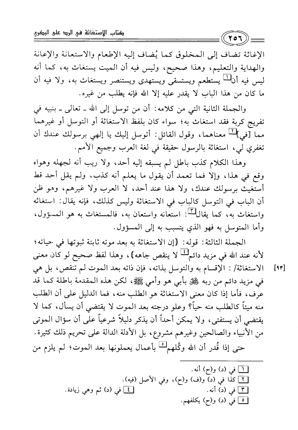 الجملة الثالثة: قوله: (إن الاستغاثة به بعد موته ثابتة ثبوتها في حياته؛ لأنه عند الله في مزيد دائم (¬4) لا ينقص جاهه)، وهذا لفظ صحيح لو كان معنى الاستغاثة: الإقسام به والتوسل بذاته، فإن ذاته بعد الموت لم تنقص، بل هي في مزيد دائم من ربه -عز وجل- بأبي هو وأمي - صلى الله عليه وسلم -، لكن هذه المقدمة باطلة كما قد عرف، فأما إذا كان معنى الاستغاثة هو الطلب منه، فما الدليل على أن الطلب منه ميتاً كالطلب منه حياً؟ وعلو درجته بعد الموت لا يقتضي أن يسأل، كما لا يقتضي أن يستفتى، ولا يمكن أحداً أن يذكر دليلاً شرعياً على أن سؤال الموتى من الأنبياء والصالحين وغيرهم مشروع، بل الأدلة الدالة على تحريم ذلك كثيرة.