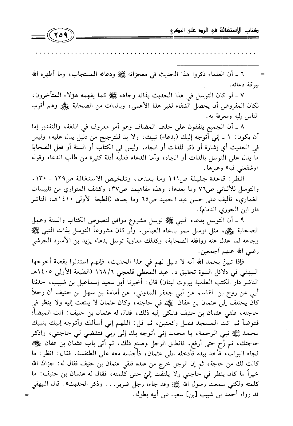 انظر: قاعدة جليلة ص 191 وما بعدها، وتلخيص الاستغاثة ص 129 - 130، والتوسل للألباني ص 76 وما بعدها، وهذه مفاهيمنا ص 37، وكشف المتواري من تلبيسات الغماري، تأليف علي حسن عبد الحميد ص 65 وما بعدها (الطبعة الأولى 1410 هـ، الناشر دار ابن الجوزي الدمام).