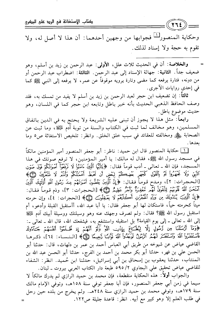(¬1) حكاية المنصور قال ابن حميد: ناظر: أبو جعفر المنصور أمير المؤمنين مالكاً في مسجد رسول الله - صلى الله عليه وسلم -، فقال له مالك: يا أمير المؤمنين، لا ترفع صوتك في هذا المسجد، فإن الله -تعالى- أدب قوماً فقال: {يَاأَيُّهَا الَّذِينَ آمَنُوا لَا تَرْفَعُوا أَصْوَاتَكُمْ فَوْقَ صَوْتِ النَّبِيِّ وَلَا تَجْهَرُوا لَهُ بِالْقَوْلِ كَجَهْرِ بَعْضِكُمْ لِبَعْضٍ أَنْ تَحْبَطَ أَعْمَالُكُمْ وَأَنْتُمْ لَا تَشْعُرُونَ (2)} [الحجرات: 2]، ومدح قوماً فقال: {إِنَّ الَّذِينَ يَغُضُّونَ أَصْوَاتَهُمْ عِنْدَ رَسُولِ اللَّهِ أُولَئِكَ الَّذِينَ امْتَحَنَ اللَّهُ قُلُوبَهُمْ لِلتَّقْوَى لَهُمْ مَغْفِرَةٌ وَأَجْرٌ عَظِيمٌ (3)} [الحجرات: 3]، وذم قوماً فقال: {إِنَّ الَّذِينَ يُنَادُونَكَ مِنْ وَرَاءِ الْحُجُرَاتِ أَكْثَرُهُمْ لَا يَعْقِلُونَ (4)} [الحجرات: 4]، وإن حرمته ميتاً كحرمته حياً، فاستكان لها أبو جعفر فقال: يا أبا عبد الله، أأستقبل القبلة وأدعو، أم استقبل رسول الله - صلى الله عليه وسلم -؟ فقال: ولم تصرف وجهك عنه وهو وسيلتك ووسيلة أبيك آدم -عليه السلام- إلى الله -تعالى- إلى يوم القيامة؟ بل استقبله واستشفع به، فيشفعك الله، قال الله -تعالى-: {وَمَا أَرْسَلْنَا مِنْ رَسُولٍ إِلَّا لِيُطَاعَ بِإِذْنِ اللَّهِ وَلَوْ أَنَّهُمْ إِذْ ظَلَمُوا أَنْفُسَهُمْ جَاءُوكَ فَاسْتَغْفَرُوا اللَّهَ وَاسْتَغْفَرَ لَهُمُ الرَّسُولُ لَوَجَدُوا اللَّهَ تَوَّابًا رَحِيمًا (64)} [النساء: 64]، ذكرها القاضي عياض عن شيوخه من طريق أبي العباس أحمد بن عمر بن دلهاث، قال: حدثنا أبو الحسن علي بن فهر، حدثنا أبو بكر محمد بن أحمد بن الفرج، حدثنا أبو الحسن عبد الله بن المنتاب، حدثنا يعقوب بن إسحاق بن أبي إسرائيل، حدثنا ابن حُميد. انظر: الشفاء للقاضي عياض تحقيق علي البجاوي 2/ 595 طبعة دار الكتاب العربي بيروت - لبنان.