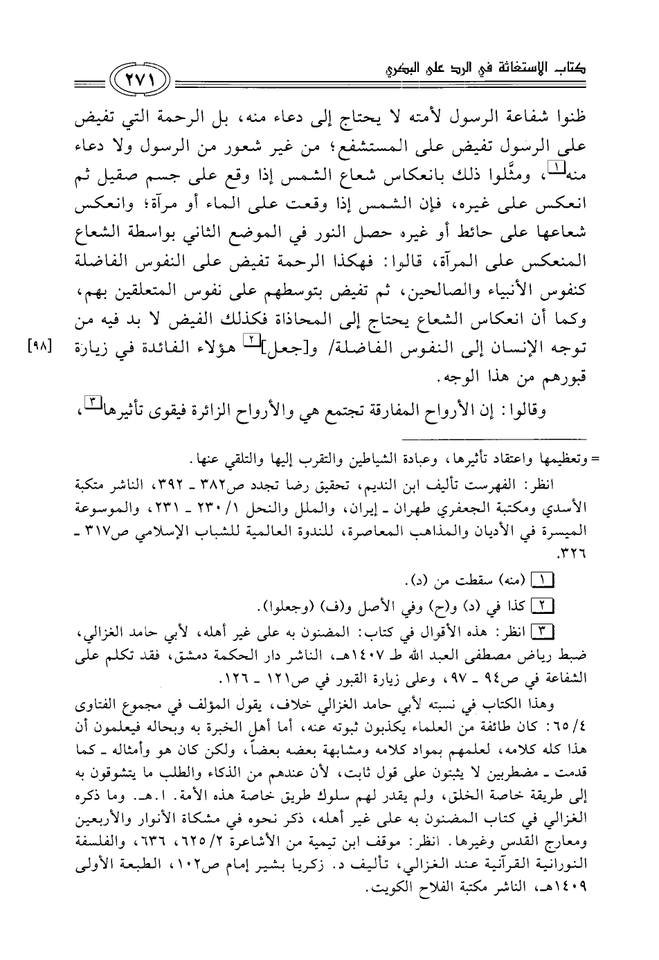 (¬3) انظر: هذه الأقوال في كتاب: المضنون به على غير أهله، لأبي حامد الغزالي، ضبط رياض مصطفى العبد الله ط 1407 هـ، الناشر دار الحكمة دمشق، فقد تكلم على الشفاعة في ص 94 - 97، وعلى زيارة القبور في ص 121 - 126.