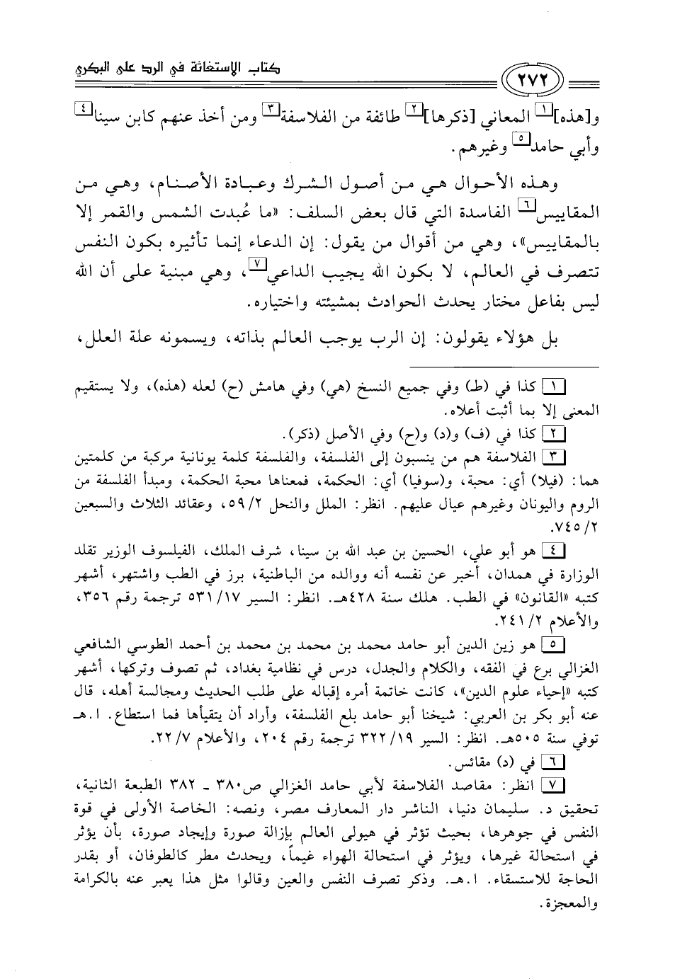 (¬7) انظر: مقاصد الفلاسفة لأبي حامد الغزالي ص 380 - 382 الطبعة الثانية، تحقيق د. سليمان دنيا، الناشر دار المعارف مصر، ونصه: الخاصة الأولى في قوة النفس في جوهرها، بحيث تؤثر في هيولى العالم بإزالة صورة وإيجاد صورة، بأن يؤثر في استحالة غيرها، ويؤثر في استحالة الهواء غيماً، ويحدث مطر كالطوفان، أو بقدر الحاجة للاستسقاء. أ. هـ. وذكر تصرف النفس والعين وقالوا مثل هذا يعبر عنه بالكرامة والمعجزة.