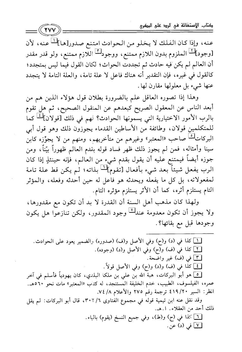 وقد نقل عنه ابن تيمية قوله في مجموع الفتاوى 6/ 302, قال أبو البركات: لم يقل ذلك أحد من العقلاء. أ. هـ.