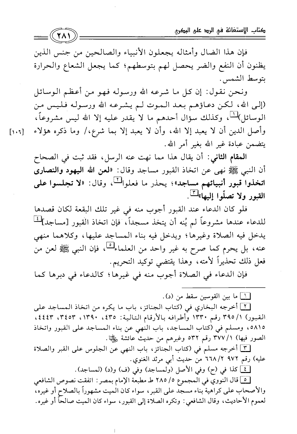 المقام الثاني: أن يقال هذا مما نهت عنه الرسل، فقد ثبت في الصحاح أن النبي - صلى الله عليه وسلم - نهى عن اتخاذ القبور مساجد وقال: "لعن الله اليهود والنصارى اتخذوا قبور أنبيائهم مساجد"؛ يحذر ما فعلوا (¬2)، وقال: "لا تجلسوا على القبور ولا تصلّوا إليها" (¬3).