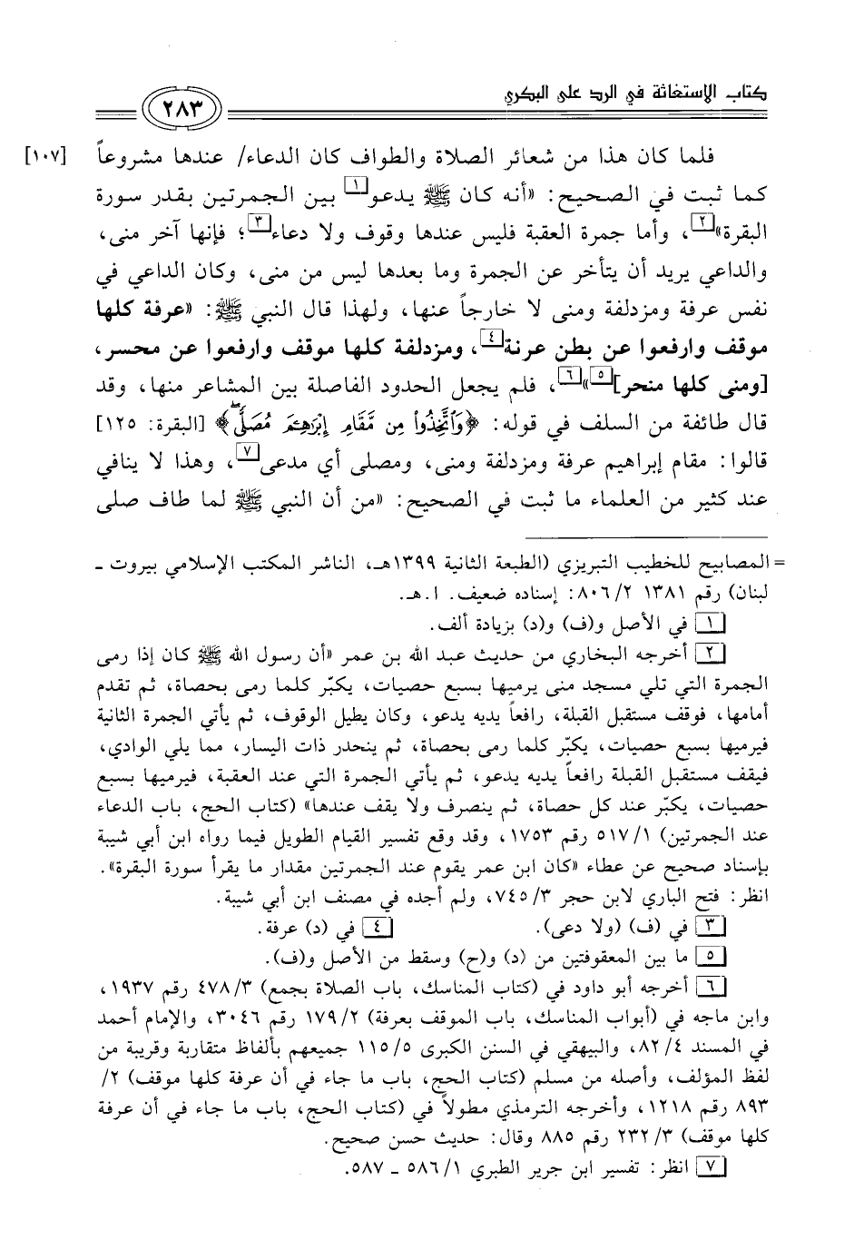 (¬2) أخرجه البخاري من حديث عبد الله بن عمر "أن رسول الله - صلى الله عليه وسلم - كان إذا رمى الجمرة التي تلي مسجد منى يرميها بسبع حصيات، يكبّر كلما رمى بحصاة، ثم تقدم أمامها، فوقف مستقبل القبلة، رافعاً يديه يدعو، وكان يطيل الوقوف، ثم يأتي الجمرة الثانية فيرميها بسبع حصيات، يكبّر كلما رمى بحصاة، ثم ينحدر ذات اليسار، مما يلي الوادي، فيقف مستقبل القبلة رافعاً يديه يدعو، ثم يأتي الجمرة التي عند العقبة، فيرميها بسبع حصيات، يكبّر عند كل حصاة، ثم ينصرف ولا يقف عندها" (كتاب الحج، باب الدعاء عند الجمرتين) 1/ 517 رقم 1753، وقد وقع تفسير القيام الطويل فيما رواء ابن أبي شيبة بإسناد صحيح عن عطاء "كان ابن عمر يقوم عند الجمرتين مقدار ما يقرأ سورة البقرة".