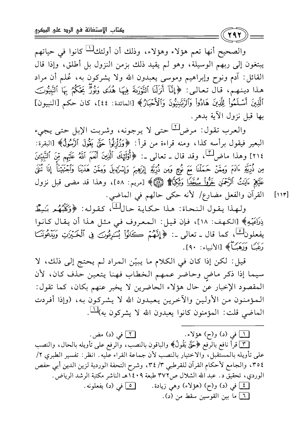 ولهذا يقول النحاة: هذا حكاية حال (¬4)، كقوله: {وَكَلْبُهُمْ بَاسِطٌ ذِرَاعَيْهِ} [الكهف: 18]، فإن قيل: المعروف في مثل هذا أن يقال كانوا يفعلون (¬5)، كما قال -تعالى-: {إِنَّهُمْ كَانُوا يُسَارِعُونَ فِي الْخَيْرَاتِ وَيَدْعُونَنَا رَغَبًا وَرَهَبًا} [الأنبياء: 90].