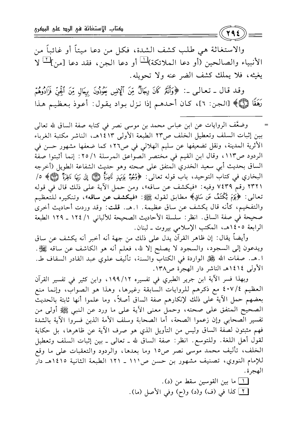وبهذا فسر الآية ابن جرير الطبري في تفسيره 12/ 199، وابن كثير في تفسير القرآن العظيم 4/ 407 مع ذكرهم للروايات السابقة وغيرها، وهذا هو الصواب، وإنما منع بعضهم حمل الآية على ذلك لإنكارهم صفة الساق أصلاً، وما علموا أنها ثابتة بالحديث الصحيح المتفق على صحته، وحمل معنى الآية على ما ورد عن النبي - صلى الله عليه وسلم - أولى من تفسير الصحابي وإن زعموا الصحة، أما الصحابة وسلف الأمة الذين فسروا الآية بالشدة فهم مثبتون لصفة الساق وليس من التأويل الذي هو صرف الآية عن ظاهرها، بل حكاية لقول أهل اللغة. وللتوسع. انظر: صفة الساق لله -تعالى- بين إثبات السلف وتعطيل الخلف، تأليف محمد موسى نصر ص 15 وما بعدها، والردود والتعقبات على ما وقع للإمام النووي، تصنيف مشهور بن حسن ص 111 - 121 الطبعة الثانية 1415 هـ دار الهجرة.