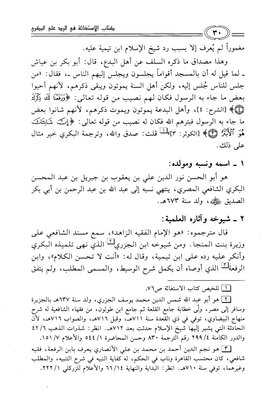 وهذا مصداق ما ذكره السلف عن أهل البدع، قال: أبو بكر بن عياش -لما قيل له أن بالمسجد أقواماً يجلسون ويجلس إليهم الناس-، فقال: "من جلس للناس جُلس إليه، ولكن أهل السنة يموتون ويبقى ذكرهم، لأنهم أحيوا بعض ما جاء به الرسول فكان لهم نصيب من قوله تعالى: {وَرَفَعْنَا لَكَ ذِكْرَكَ (4)} [الشرح: 4]، وأهل البدعة يموتون ويموت ذكرهم، لأنهم شانوا بعض ما جاء به الرسول فبترهم الله فكان له نصيب من قوله تعالى: {إِنَّ شَانِئَكَ هُوَ الْأَبْتَرُ (3)} [الكوثر: 3] " (¬1) قلت: صدق والله، وترجمة البكري خير مثال على ذلك.