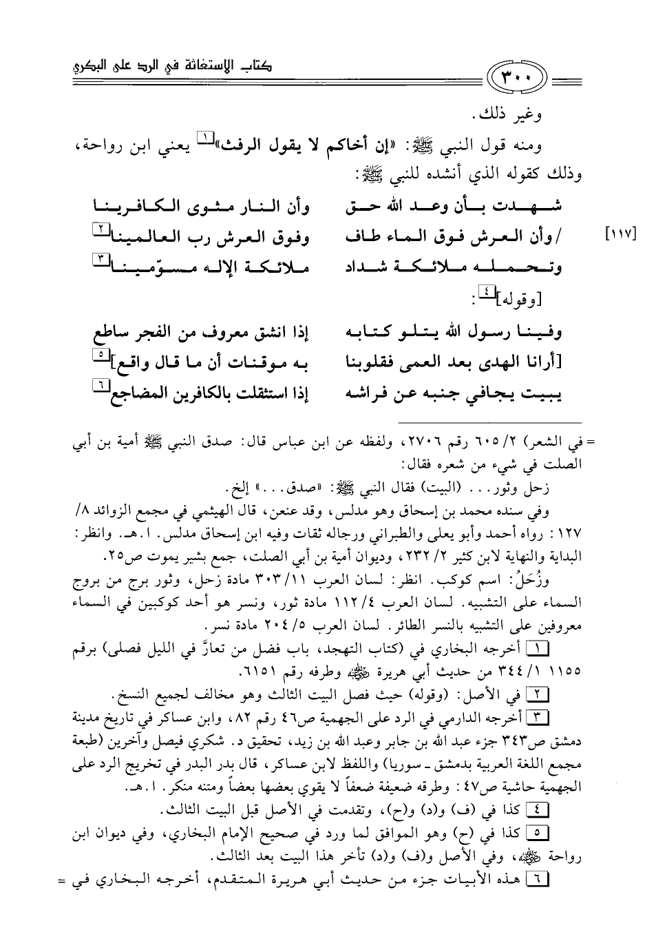 (¬3) أخرجه الدارمي في الرد على الجهمية ص 46 رقم 82، وابن عساكر في تاريخ مدينة دمشق ص 343 جزء عبد الله بن جابر وعبد الله بن زيد، تحقيق د. شكرى فيصل وآخرين (طبعة مجمع اللغة العربية بدمشق - سوريا) واللفظ لابن عساكر، قال بدر البدر في تخريج الرد على الجهمية حاشية ص 47: وطرقه ضعيفة ضعفاً لا يقوي بعضها بعضاً ومتنه منكر. أ. هـ.