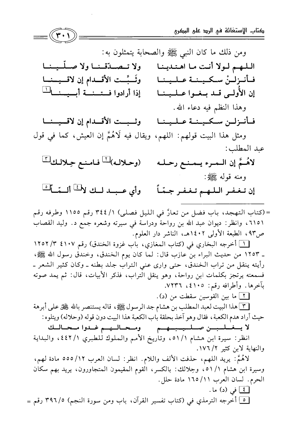 (¬1) أخرجه البخاري في (كتاب المغازي، باب غزوة الخندق) رقم 4107، 3/ 1252 - 1253 من حديث البراء بن عازب قال: لما كان يوم الخندق، وخندق رسول الله - صلى الله عليه وسلم -، رأيته ينقل من تراب الخندق، حتى وارى عني التراب بجلد بطنه -وكان كثير الشعر- فسمعته يرتجز بكلمات ابن رواحة، وهو ينقل التراب، فذكر الأبيات، قال: ثم يمد صوته بآخرها. وأطرافه رقم: 4105، 7236.