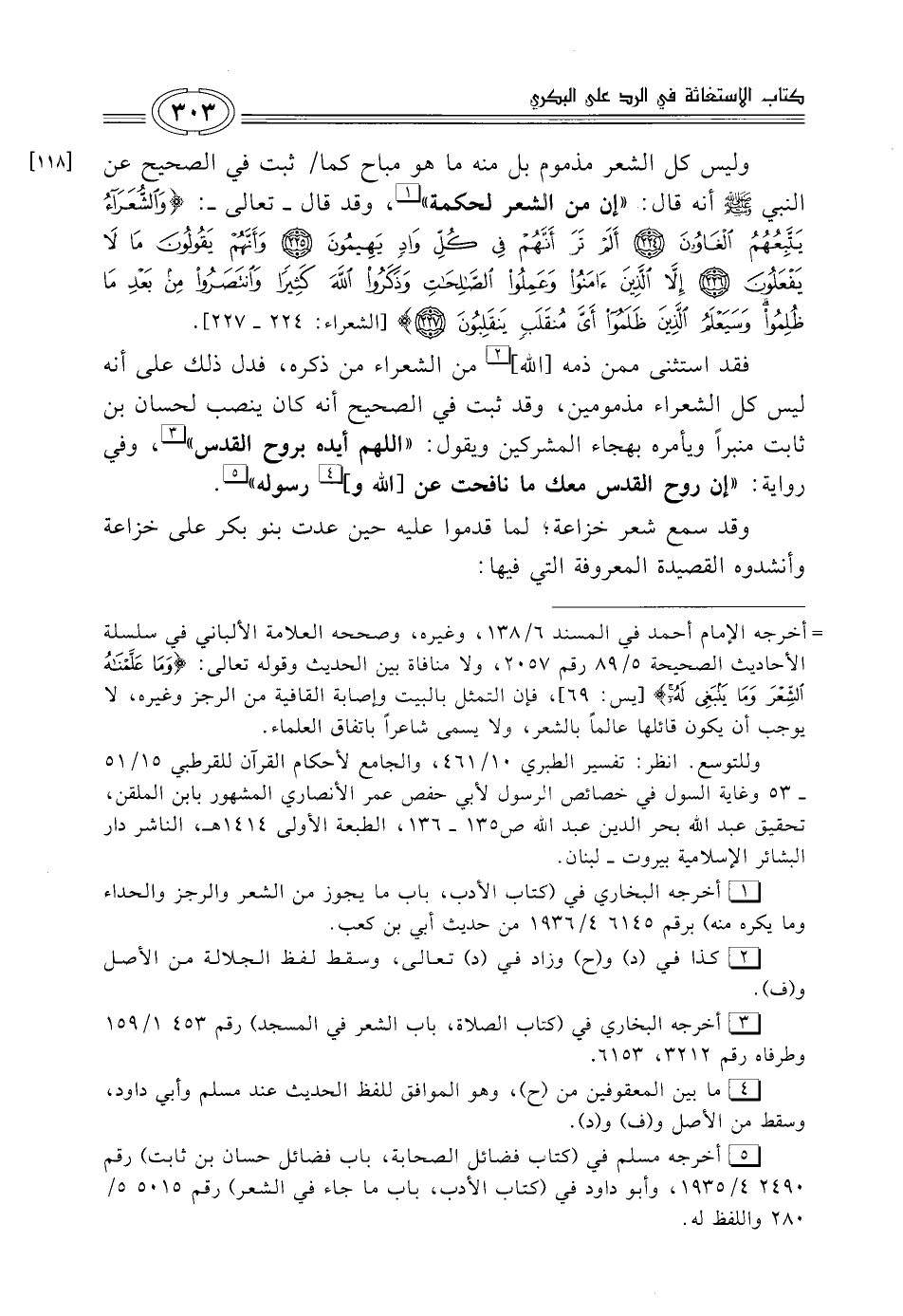 فقد استثنى ممن ذمه [الله] (¬2) من الشعراء من ذكره، فدل ذلك على أنه ليس كل الشعراء مذمومين، وقد ثبت في الصحيح أنه كان ينصب لحسان بن ثابت منبراً ويأمره بهجاء المشركين ويقول: "اللهم أيده بروح القدس" (¬3)، وفي رواية: "إن روح القدس معك ما نافحت عن [الله و] (¬4) رسوله" (¬5).