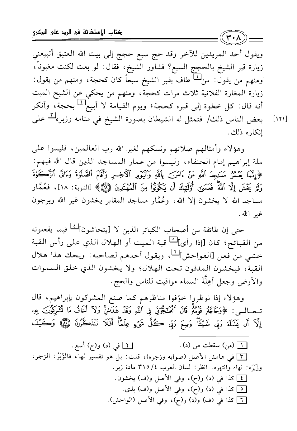 ويقول أحد المريدين للآخر وقد حج سبع حجج إلى بيت الله العتيق أتبيعني زيارة قبر الشيخ بالحجج السبع؟ فشاور الشيخ، فقال: لو بعت لكنت مغبوناً، ومنهم من يقول: من (¬1) طاف بقبر الشيخ سبعاً كان كحجة، ومنهم من يقول: زيارة المغارة الفلانية ثلاث مرات كحجة، ومنهم من يحكي عن الشيخ الميت أنه قال: كل خطوة إلى قبره كحجة؛ ويوم القيامة لا أبيع (¬2) بحجة، وأنكر بعض الناس ذلك فتمثل له الشيطان بصورة الشيخ في منامه وزبره (¬3) على إنكاره ذلك.