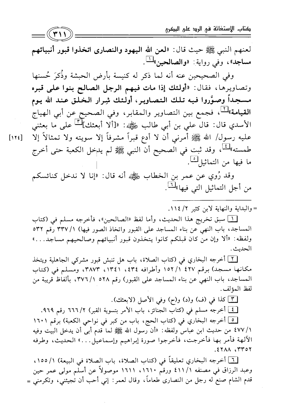 وفي الصحيحين عنه أنه لما ذكر له كنيسة بأرض الحبشة وذُكرَ حُسنها وتصاويرها، فقال: "أولئك إذا مات فيهم الرجل الصالح بنوا على قبره مسجداً وصوَّروا فيه تلك التصاوير، أولئك شِرار الخلق عند الله يوم القيامة" (¬2)، فجمع بين التصاوير والمقابر، وفي الصحيح عن أبي الهياج الأسدي قال: قال علي بن أبي طالب -رضي الله عنه-: " [ألا أبعثك] (¬3) على ما بعثني عليه رسول الله - صلى الله عليه وسلم - أمرني أن لا أدع قبراً مشرفاً إلا سويته ولا تمثالاً إلا طمسته" (¬4)، وقد ثبت في الصحيح أن النبي - صلى الله عليه وسلم - لم يدخل الكعبة حتى أخرج ما فيها من التماثيل (¬5).