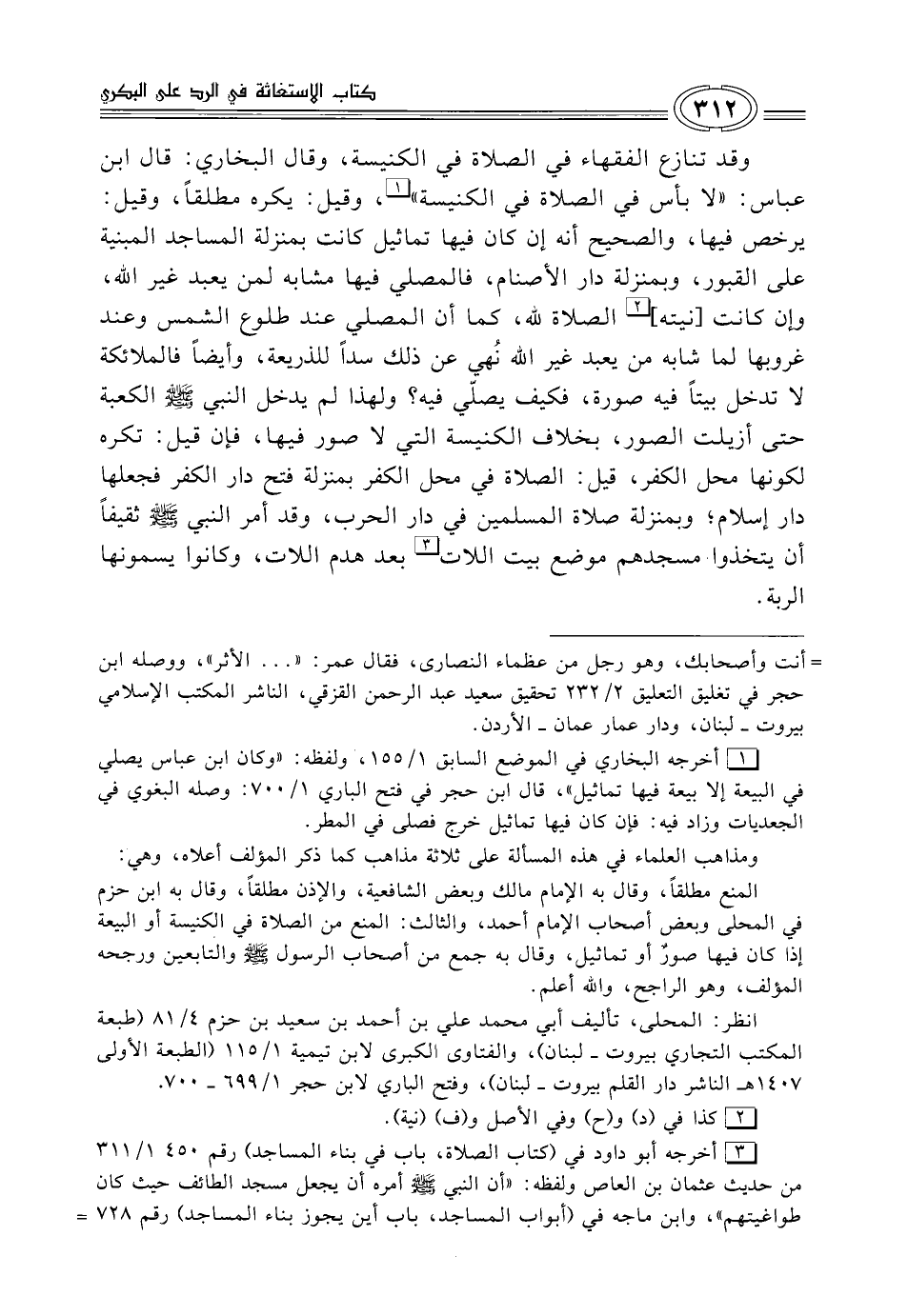 انظر: المحلى، تأليف أبي محمد علي بن أحمد بن سعيد بن حزم 4/ 81 (طبعة المكتب التجاري بيروت - لبنان)، والفتاوى الكبرى لابن تيمية 1/ 115 (الطبعة الأولى 1407 هـ الناشر دار القلم بيروت - لبنان)، وفتح الباري لابن حجر 1/ 699 - 700.