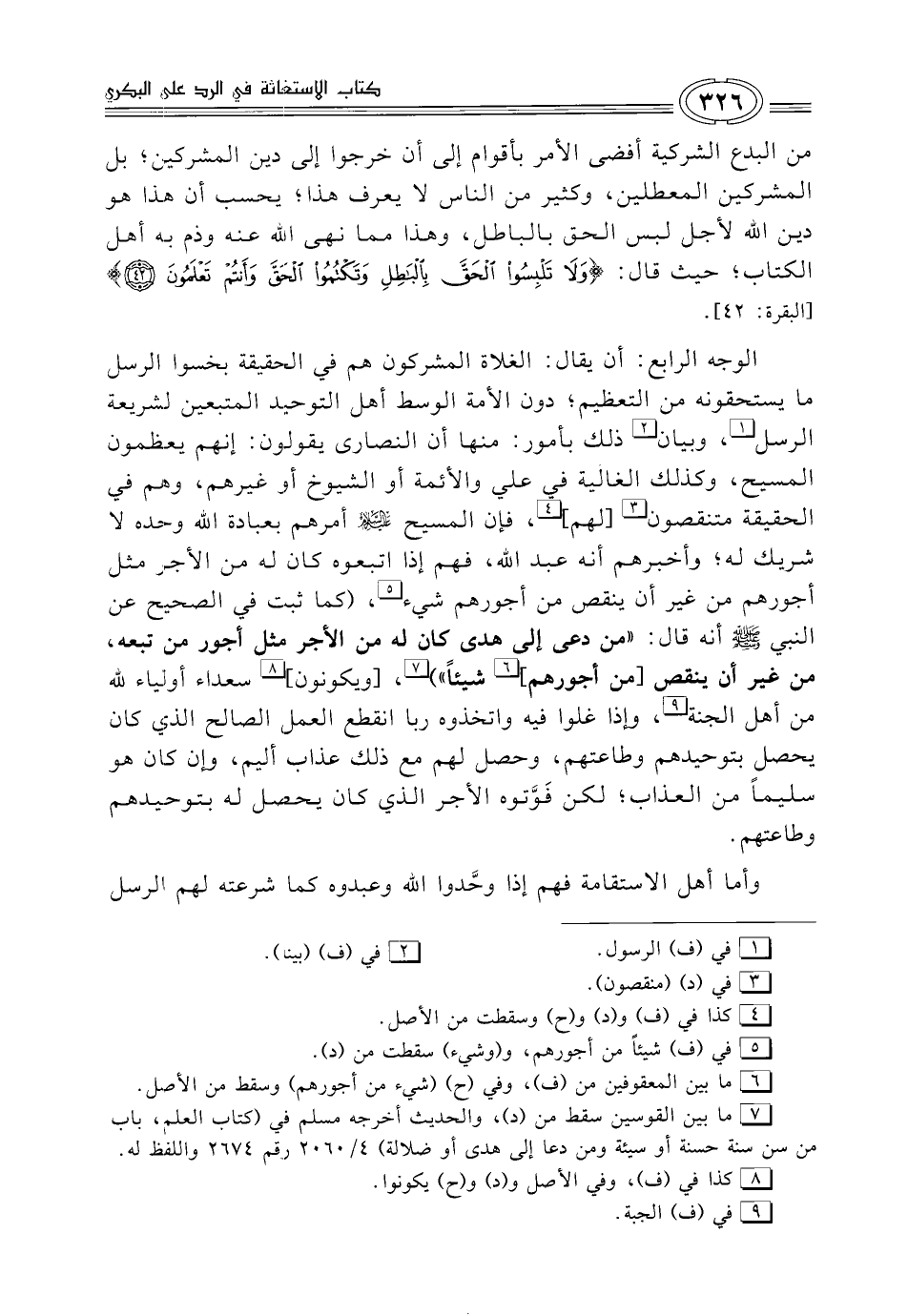 الوجه الرابع: أن يقال: الغلاة المشركون هم في الحقيقة بخسوا الرسل ما يستحقونه من التعظيم؛ دون الأمة الوسط أهل التوحيد المتبعين لشريعة الرسل (¬1)، وبيان (¬2) ذلك بأمور: منها أن النصارى يقولون: إنهم يعظمون المسيح، وكذلك الغالية في علي والأئمة أو الشيوخ أو غيرهم، وهم في الحقيقة متنقصون (¬3) [لهم] (¬4)، فإن المسيح -عليه السلام- أمرهم بعبادة الله وحده لا شريك له؛ وأخبرهم أنه عبد الله، فهم إذا اتبعوه كان له من الأجر مثل أجورهم من غير أن ينقص من أجورهم شيء (¬5)، (كما ثبت في الصحيح عن النبي - صلى الله عليه وسلم - أنه قال: "من دعى إلى هدى كان له من الأجر مثل أجور من تبعه، من غير أن ينقص [من أجورهم] (¬6) شيئاً") (¬7)، [ويكونون] (¬8) سعداء أولياء لله من أهل الجنة (¬9)، وإذا غلوا فيه واتخذوه ربا انقطع العمل الصالح الذي كان يحصل بتوحيدهم وطاعتهم، وحصل لهم مع ذلك عذاب أليم، وإن كان هو سليماً من العذاب؛ لكن فَوَّتوه الأجر الذي كان يحصل له بتوحيدهم وطاعتهم.