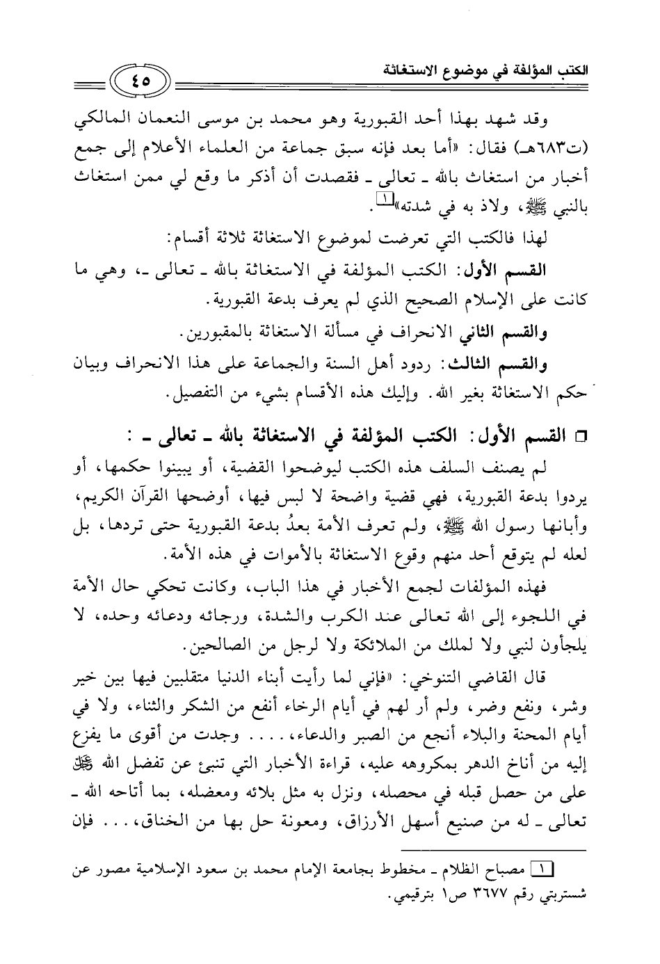 القسم الأول: الكتب المؤلفة في الاستغاثة بالله -تعالى-، وهي ما كانت على الإسلام الصحيح الذي لم يعرف بدعة القبورية.