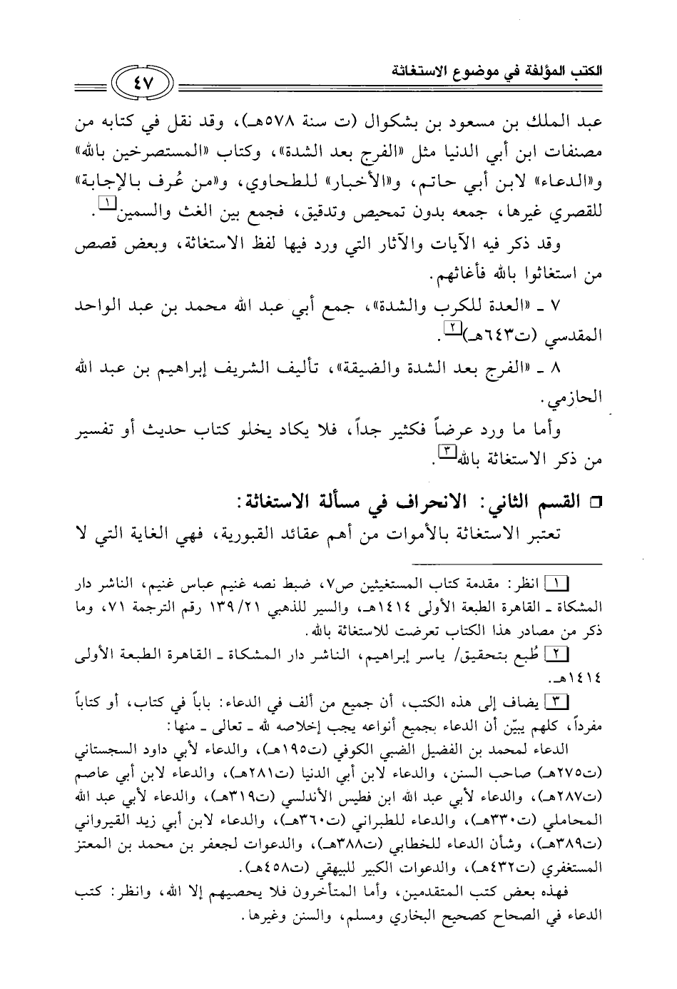 (¬1) انظر: مقدمة كتاب المستغيثين ص 7، ضبط نصه غنيم عباس غنيم، الناشر دار المشكاة - القاهرة الطبعة الأولى 1414 هـ، والسير للذهبي 21/ 139 رقم الترجمة 71، وما ذكر من مصادر هذا الكتاب تعرضت للاستغاثة بالله.