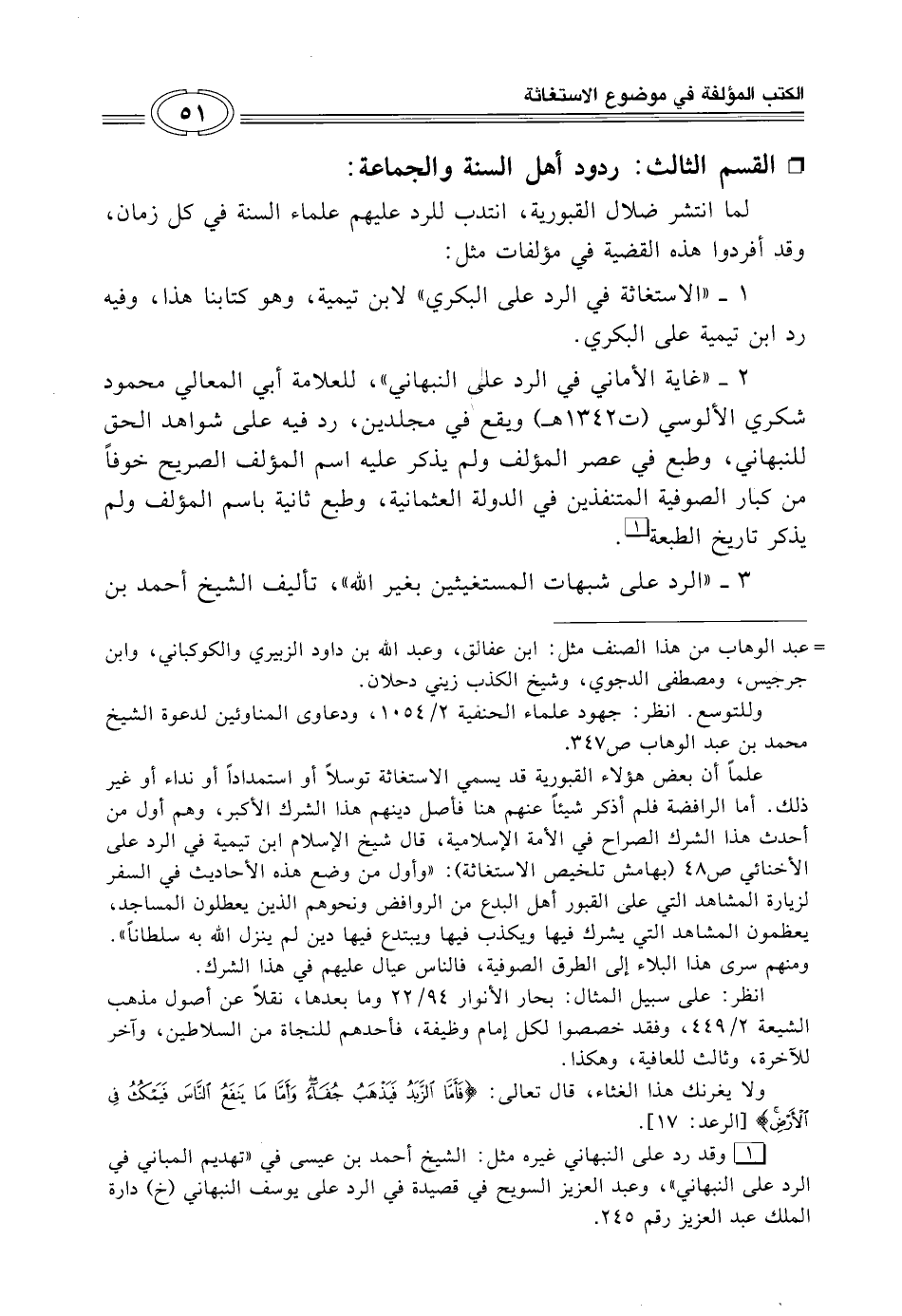 (¬1) وقد رد على النبهاني غيره مثل: الشيخ أحمد بن عيسى في "تهديم المباني في الرد على النبهاني"، وعبد العزيز السويح في قصيدة في الرد على يوسف النبهاني (خ) دارة الملك عبد العزيز رقم 245.