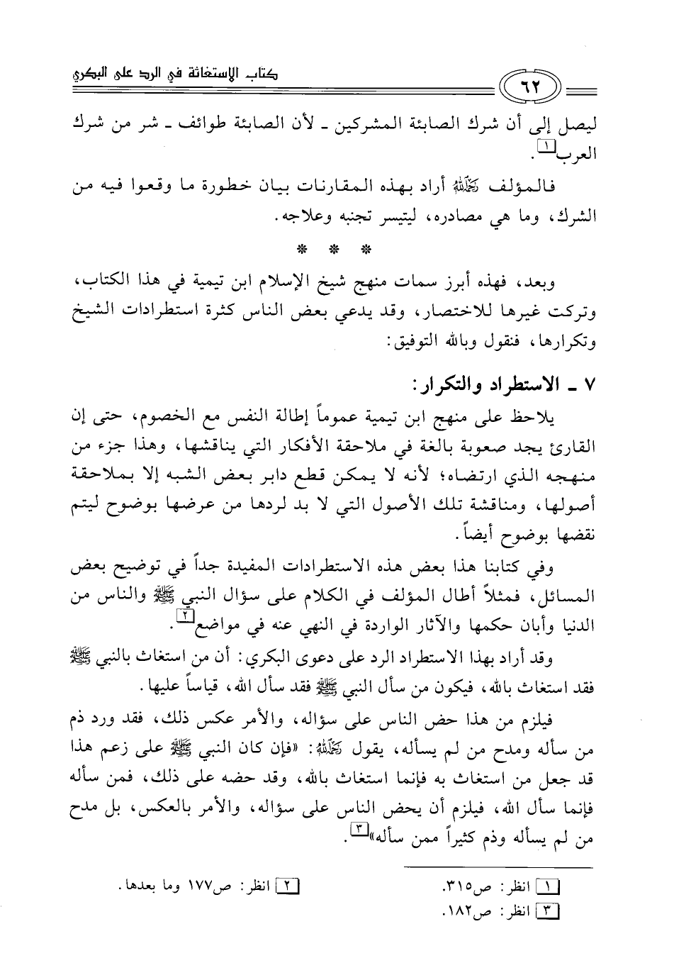 وبعد، فهذه أبرز سمات منهج شيخ الإسلام ابن تيمية في هذا الكتاب، وتركت غيرها للاختصار، وقد يدعي بعض الناس كثرة استطرادات الشيخ وتكرارها، فنقول وبالله التوفيق: