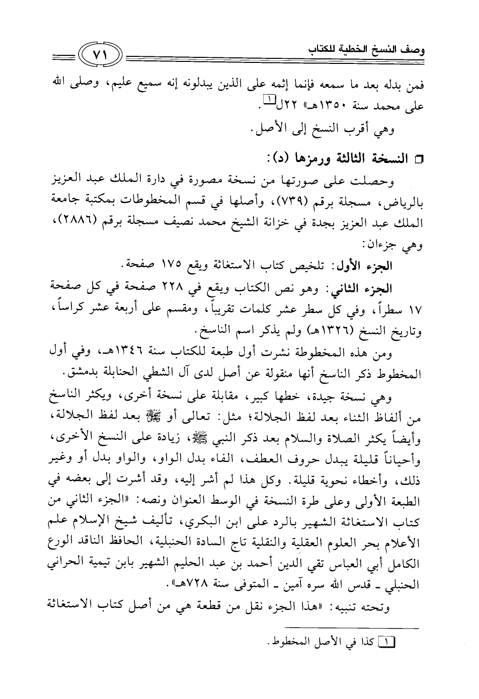 وهي نسخة جيدة، خطها كبير، مقابلة على نسخة أخرى، ويكثر الناسخ من ألفاظ الثناء بعد لفظ الجلالة؛ مثل: تعالى أو -سبحانه وتعالى- بعد لفظ الجلالة، وأيضاً يكثر الصلاة والسلام بعد ذكر النبي - صلى الله عليه وسلم -، زيادة على النسخ الأخرى، وأحياناً قليلة يبدل حروف العطف، الفاء بدل الواو، والواو بدل أو وغير ذلك، وأخطاء نحوية قليلة. وكل هذا لم أشر إليه، وقد أشرت إلى بعضه في الطبعة الأولى وعلى طرة النسخة في الوسط العنوان ونصه: "الجزء الثاني من كتاب الاستغاثة الشهير بالرد على ابن البكري، تأليف شيخ الإسلام علم الأعلام بحر العلوم العقلية والنقلية تاج السادة الحنبلية، الحافظ الناقد الورع الكامل أبي العباس تقي الدين أحمد بن عبد الحليم الشهير بابن تيمية الحراني الحنبلي -قدس الله سره آمين- المتوفى سنة 728 هـ".