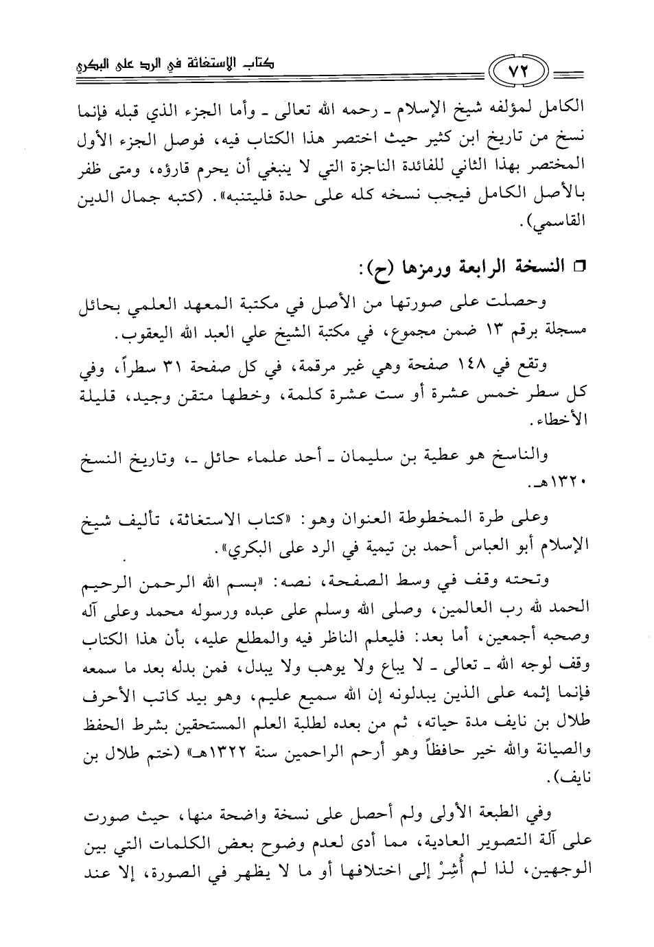 وتحته وقف في وسط الصفحة، نصه: "بِسْمِ اللَّهِ الرَّحْمَنِ الرَّحِيمِ الحمد لله رب العالمين، وصلى الله وسلم على عبده ورسوله محمد وعلى آله وصحبه أجمعين، أما بعد: فليعلم الناظر فيه والمطلع عليه، بأن هذا الكتاب وقف لوجه الله -تعالى- لا يباع ولا يوهب ولا يبدل، فمن بدله بعدما سمعه فإنما إثمه على الذين يبدلونه إن الله سميع عليم، وهو بيد كاتب الأحرف طلال بن نايف مدة حياته، ثم من بعده لطلبة العلم المستحقين بشرط الحفظ والصيانة والله خير حافظاً وهو أرحم الراحمين سنة 1322 هـ" (ختم طلال بن نايف).