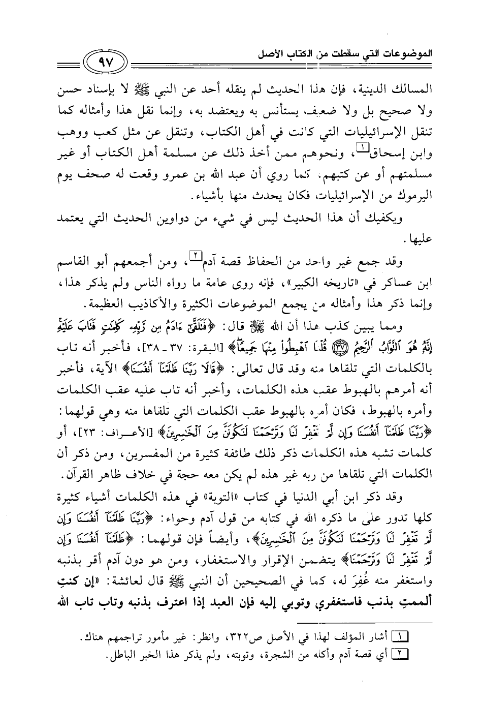 وقد ذكر ابن أبي الدنيا في كتاب "التوبة" في هذه الكلمات أشياء كثيرة كلها تدور على ما ذكره الله في كتابه من قول آدم وحواء: {رَبَّنَا ظَلَمْنَا أَنْفُسَنَا وَإِنْ لَمْ تَغْفِرْ لَنَا وَتَرْحَمْنَا لَنَكُونَنَّ مِنَ الْخَاسِرِينَ}، وأيضاً فإن قولهما: {ظَلَمْنَا أَنْفُسَنَا وَإِنْ لَمْ تَغْفِرْ لَنَا وَتَرْحَمْنَا} يتضمن الإقرار والاستغفار، ومن هو دون آدم أقر بذنبه واستغفر منه غُفِرَ له، كما في الصحيحين أن النبي - صلى الله عليه وسلم - قال لعائشة: "إن كنتِ ألممتِ بذنب فاستغفري وتوبي إليه فإن العبد إذا اعترف بذنبه وتاب تاب الله
