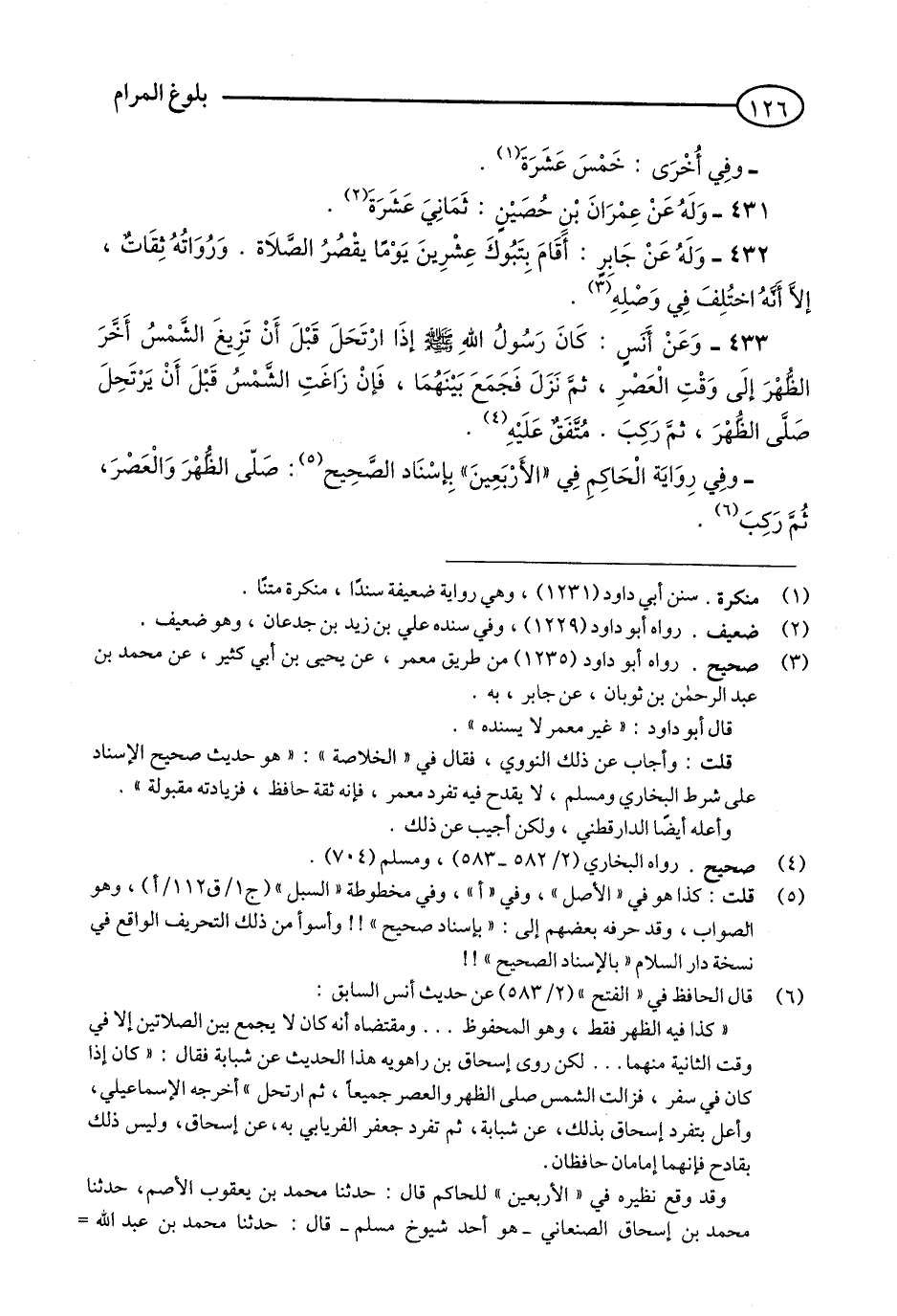 (2) - قال الحافظ في «الفتح» (2/ 583) عن حديث أنس السابق: «كذا فيه الظهر فقط، وهو المحفوظ ... ومقتضاه أنه كان لا يجمع بين الصلاتين إلا في وقت الثانية منهما ... لكن روى إسحاق بن رهوايه هذا الحديث عن شبابة فقال: «كان إذا كان في سفر، فزالت الشمس صلى الظهر والعصر جميعا، ثم ارتحل» أخرجه الإسماعيلي، وأعل بتفرد إسحاق بذلك، عن شبابة، ثم تفرد جعفر الفريابي به، عن إسحاق، وليس ذلك بقادح فإنهما إمامان حافظان. وقد وقع نظيره في «الأربعين» للحاكم قال: حدثنا محمد بن يعقوب الأصم، حدثنا محمد بن إسحاق الصنعاني -هو أحد شيوخ مسلم- قال: حدثنا محمد بن عبد الله الواسطي، فذكر الحديث، وفيه: «فإن زاغت الشمس قبل أن يرتحل صلى الظهر والعصر، ثم ركب». قال الحافظ: صلاح الدين العلائي: هكذا وجدته بعد التتبع في نسخ كثيرة من «الأربعين» بزيادة العصر. وسند هذه الزيادة جيد. انتهى. قلت: القائل: ابن حجر- وهي متابعة قوية لرواية إسحاق بن رهوايه، إن كانت ثابتة، لكن في ثبوتها نظر». انتهى من «الفتح». قلت: انظر كيف جزم هنا في البلوغ بصحة سنده، دون متابعة وتردد في «الفتح» مع وجود هذه المتابعة القوية التي ذكرها.