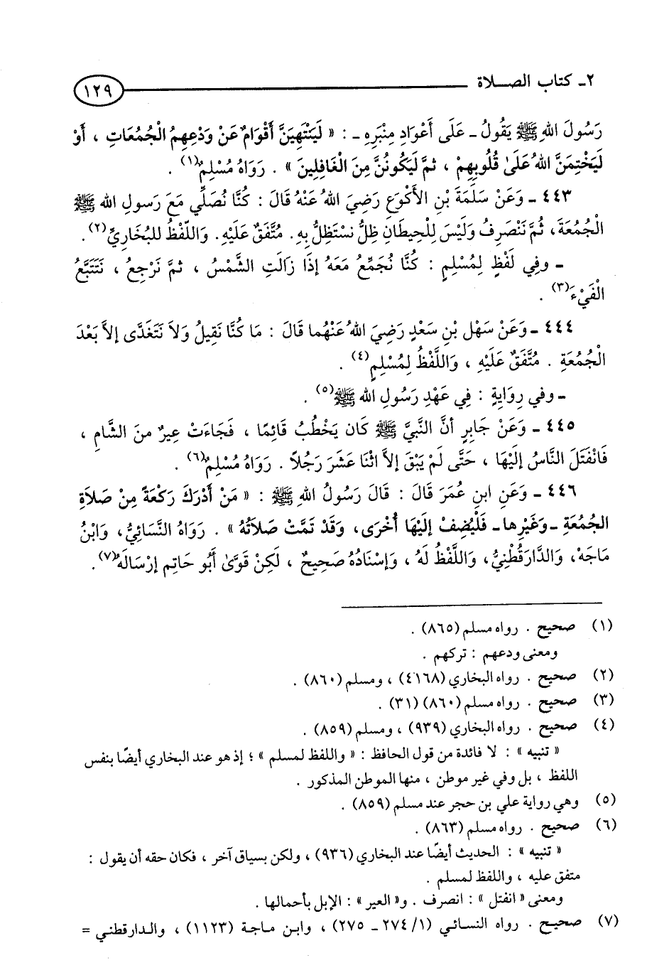 446 - وَعَنِ ابْنِ عُمَرَ قَالَ: قَالَ رَسُولُ اللَّهِ - صلى الله عليه وسلم: «مَنْ أَدْرَكَ رَكْعَةً مِنْ صَلَاةِ الْجُمُعَةِ وَغَيْرِهَا فَلْيُضِفْ إِلَيْهَا أُخْرَى, وَقَدْ تَمَّتْ صَلَاتُهُ». رَوَاهُ النَّسَائِيُّ, وَابْنُ مَاجَهْ, وَالدَّارَقُطْنِيُّ, وَاللَّفْظُ لَهُ, وَإِسْنَادُهُ صَحِيحٌ, لَكِنْ قَوَّى أَبُو حَاتِمٍ إِرْسَالَهُ. (1)