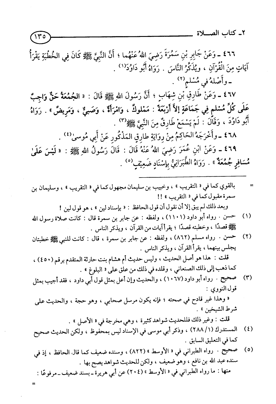469 - وَعَنِ ابْنِ عُمَرَ - رضي الله عنه - قَالَ: قَالَ رَسُولُ اللَّهِ - صلى الله عليه وسلم: «لَيْسَ عَلَى مُسَافِرٍ جُمُعَةٌ». رَوَاهُ الطَّبَرَانِيُّ بِإِسْنَادٍ ضَعِيفٍ. (1)