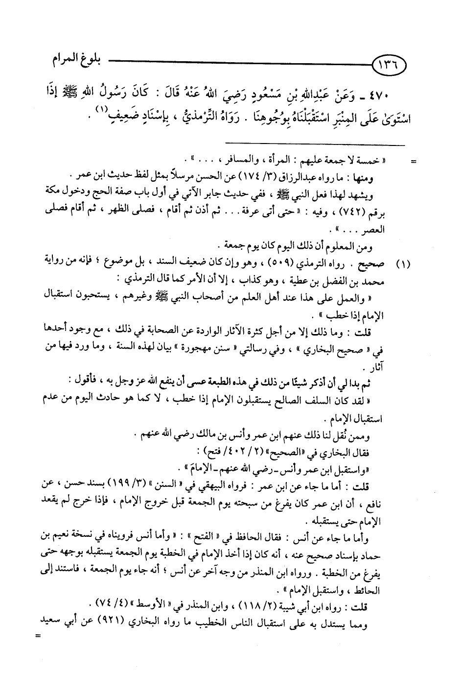 470 - وَعَنْ عَبْدِ اللَّهِ بْنِ مَسْعُودٍ - رضي الله عنه - قَالَ: كَانَ رَسُولُ اللَّهِ - صلى الله عليه وسلم -[إِذَا] (1) اسْتَوَى عَلَى الْمِنْبَرِ اسْتَقْبَلْنَاهُ بِوُجُوهِنَا. رَوَاهُ التِّرْمِذِيُّ, بِإِسْنَادٍ ضَعِيفٍ. (2)