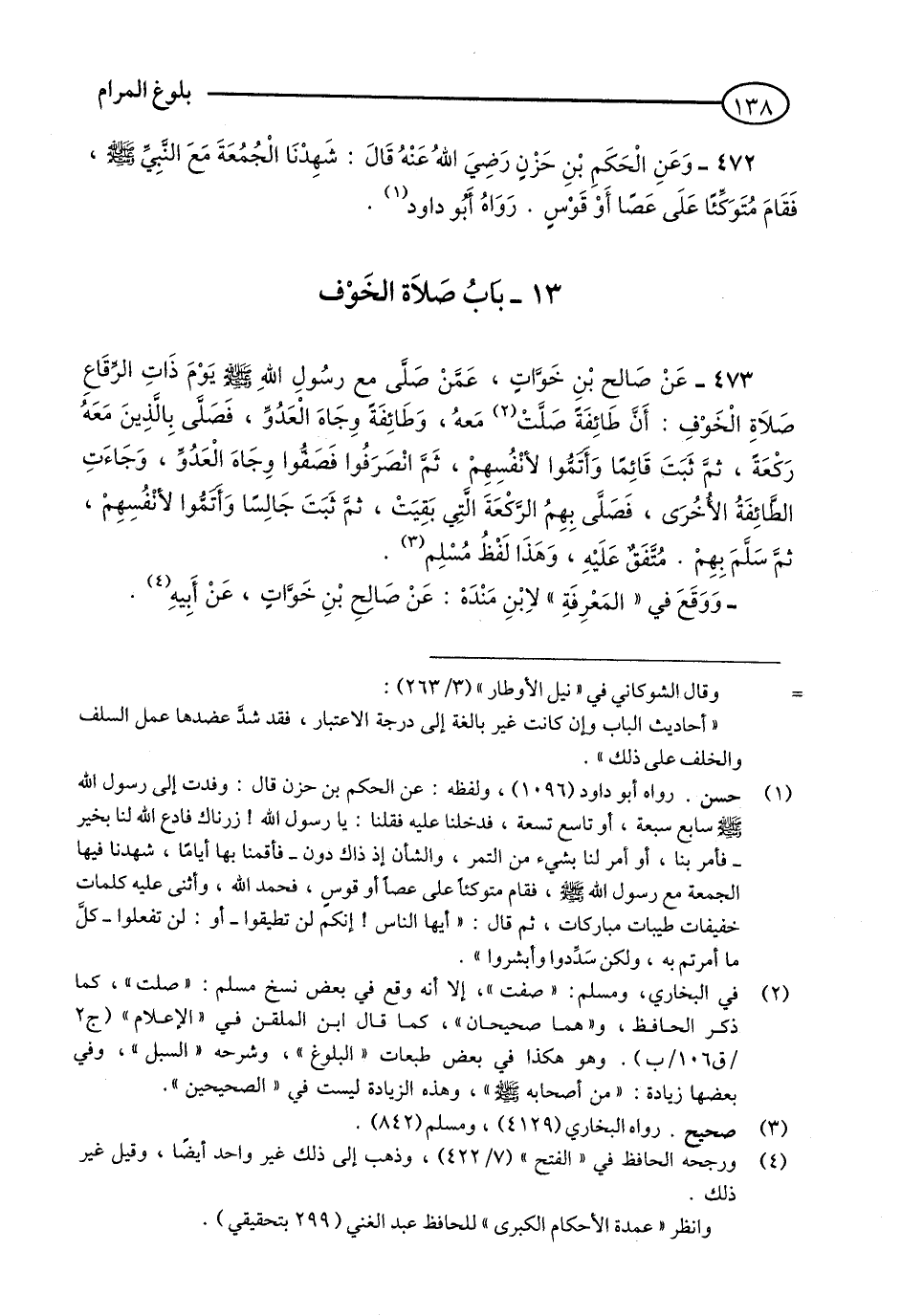 473 - عَنْ صَالِحِ بْنِ خَوَّاتٍ, - عَمَّنْ صَلَّى مَعَ رَسُولِ اللَّهِ - صلى الله عليه وسلم - يَوْمَ ذَاتِ الرِّقَاعِ صَلَاةَ الْخَوْفِ: أَنَّ طَائِفَةً صَلَّتْ (1) مَعَهُ وَطَائِفَةٌ وِجَاهَ الْعَدُوِّ, فَصَلَّى بِالَّذِينَ مَعَهُ رَكْعَةً, ثُمَّ ثَبَتَ قَائِمًا وَأَتَمُّوا لِأَنْفُسِهِمْ, ثُمَّ انْصَرَفُوا فَصَفُّوا وِجَاهَ الْعَدُوِّ, وَجَاءَتِ الطَّائِفَةُ الْأُخْرَى, فَصَلَّى بِهِمُ الرَّكْعَةَ الَّتِي بَقِيَتْ, ثُمَّ ثَبَتَ جَالِسًا وَأَتَمُّوا لِأَنْفُسِهِمْ, ثُمَّ سَلَّمَ بِهِمْ. مُتَّفَقٌ عَلَيْهِ, وَهَذَا لَفْظُ مُسْلِمٍ. (2)