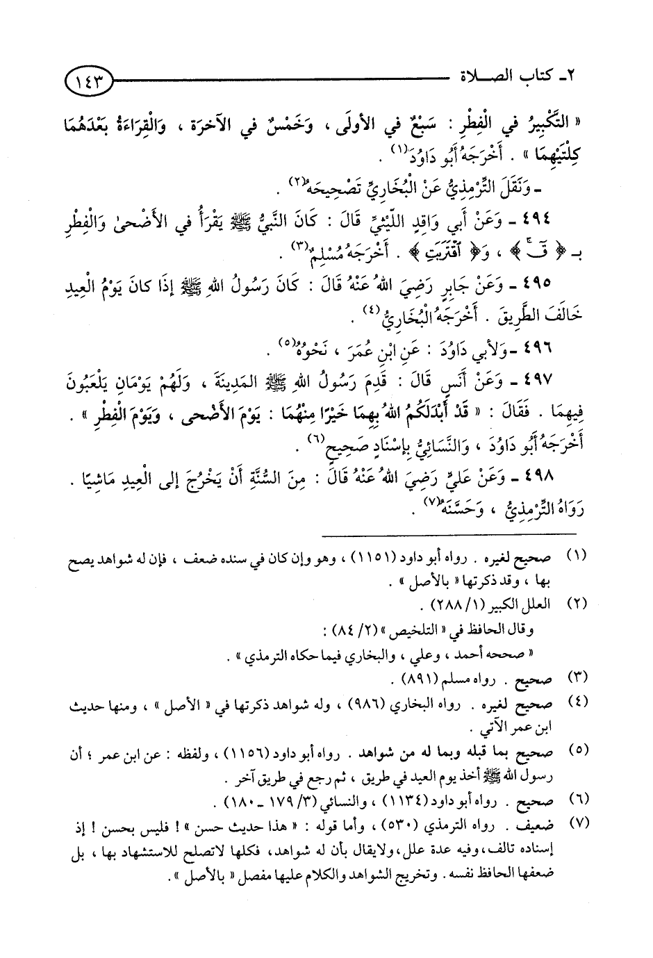 498 - وَعَنْ عَلِيٍّ - رضي الله عنه - قَالَ: مِنَ السُّنَّةِ أَنْ يَخْرُجَ إِلَى الْعِيدِ مَاشِيًا. رَوَاهُ التِّرْمِذِيُّ, وَحَسَّنَهُ. (1)