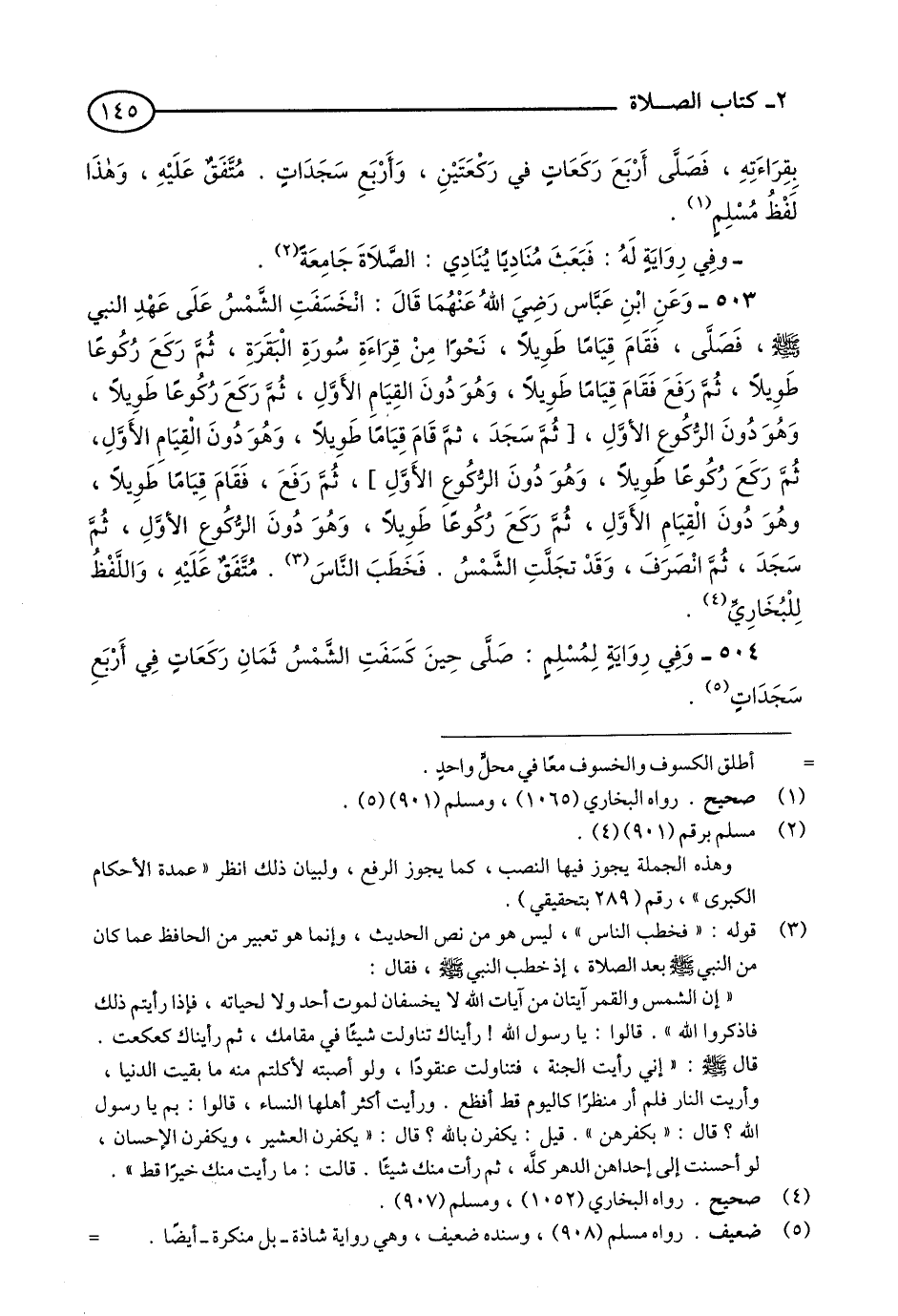503 - وَعَنِ ابْنِ عَبَّاسٍ رَضِيَ اللَّهُ عَنْهُمَا قَالَ: انْخَسَفَتِ الشَّمْسُ عَلَى عَهْدِ النَّبِيِّ - صلى الله عليه وسلم - فَصَلَّى, فَقَامَ قِيَامًا طَوِيلًا, نَحْوًا مِنْ قِرَاءَةِ سُورَةِ الْبَقَرَةِ, ثُمَّ رَكَعَ رُكُوعًا طَوِيلًا, ثُمَّ رَفَعَ فَقَامَ قِيَامًا طَوِيلًا وَهُوَ دُونَ الْقِيَامِ الْأَوَّلِ, ثُمَّ رَكَعَ رُكُوعًا طَوِيلًا, وَهُوَ دُونَ الرُّكُوعِ الْأَوَّلِ, [ثُمَّ سَجَدَ, ثُمَّ قَامَ قِيَامًا طَوِيلًا, وَهُوَ دُونَ الْقِيَامِ الْأَوَّلِ, ثُمَّ رَكَعَ رُكُوعًا طَوِيلًا, وَهُوَ دُونَ الرُّكُوعِ الْأَوَّلِ] , ثُمَّ رَفَعَ, فَقَامَ قِيَامًا طَوِيلًا, وَهُوَ دُونَ الْقِيَامِ الْأَوَّلِ, ثُمَّ رَكَعَ رُكُوعًا طَوِيلًا, وَهُوَ دُونَ الرُّكُوعِ الْأَوَّلِ, ثُمَّ سَجَدَ, ثُمَّ انْصَرَفَ وَقَدْ تَجَلَّتِ الشَّمْسُ. فَخَطَبَ النَّاسَ. (1) مُتَّفَقٌ عَلَيْهِ, وَاللَّفْظُ لِلْبُخَارِيِّ. (2)