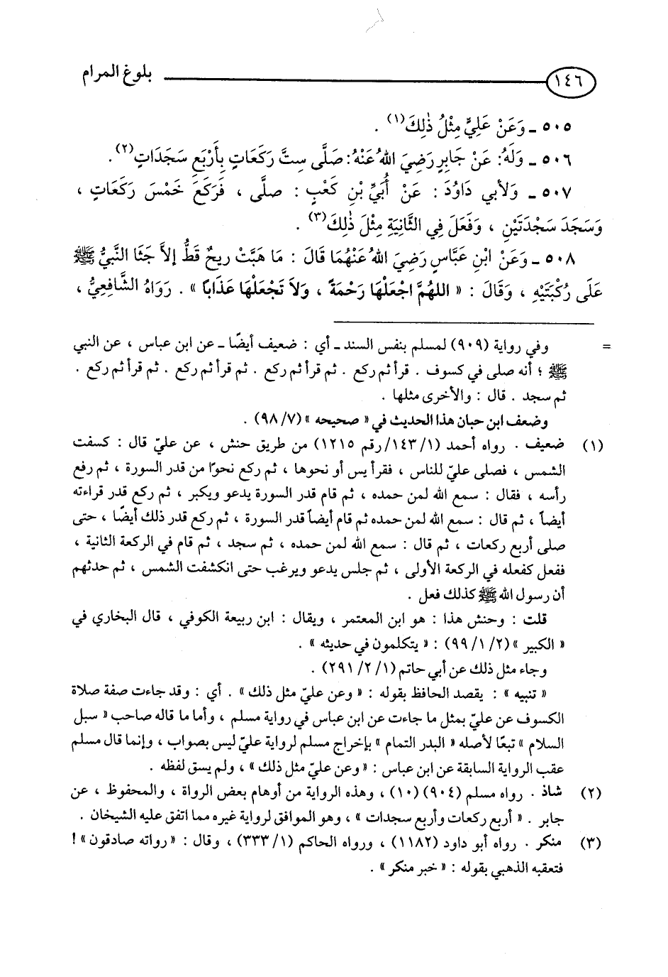 (1) - ضعيف. رواه أحمد (1/ 143/رقم 1215) من طريق حنش، عن علي قال: كسفت الشمس، فصلى علي للناس، فقرأ يس أو نحوها، ثم ركع نحوا من قدر السورة، ثم رفع رأسه، فقال: سمع الله لمن حمده، ثم قام قدر السورة يدعو ويكبر، ثم ركع قدر قراءته أيضا، ثم قال: سمع الله لمن حمده ثم قام أيضا قدر السورة، ثم ركع قدر ذلك أيضا، حتى صلى أربع ركعات، ثم قال: سمع الله لمن حمده، ثم سجد، ثم قام في الركعة الثانية، ففعل كفعله في الركعة الأولى، ثم جلس يدعو ويرغب حتى انكشفت الشمس، ثم حدثهم أن رسول الله صلى الله عليه وسلم كذلك فعل. قلت: وحنش هذا: هو ابن المعتمر، ويقال: ابن ربيعة الكوفي، قال البخاري في «الكبير» (2/ 1/99): «يتكلمون في حديثه». وجاء مثل ذلك عن أبي حاتم (1/ 2/291) «تنبيه»: يقصد الحافظ بقوله: وعن علي مثل ذلك. أي: وقد جاءت صفة صلاة الكسوف عن علي بمثل ما جاءت عن ابن عباس في رواية مسلم، وأما فهمه صاحب «سبل السلام» تبعا لأصله «البدر التمام» فليس هو المراد.