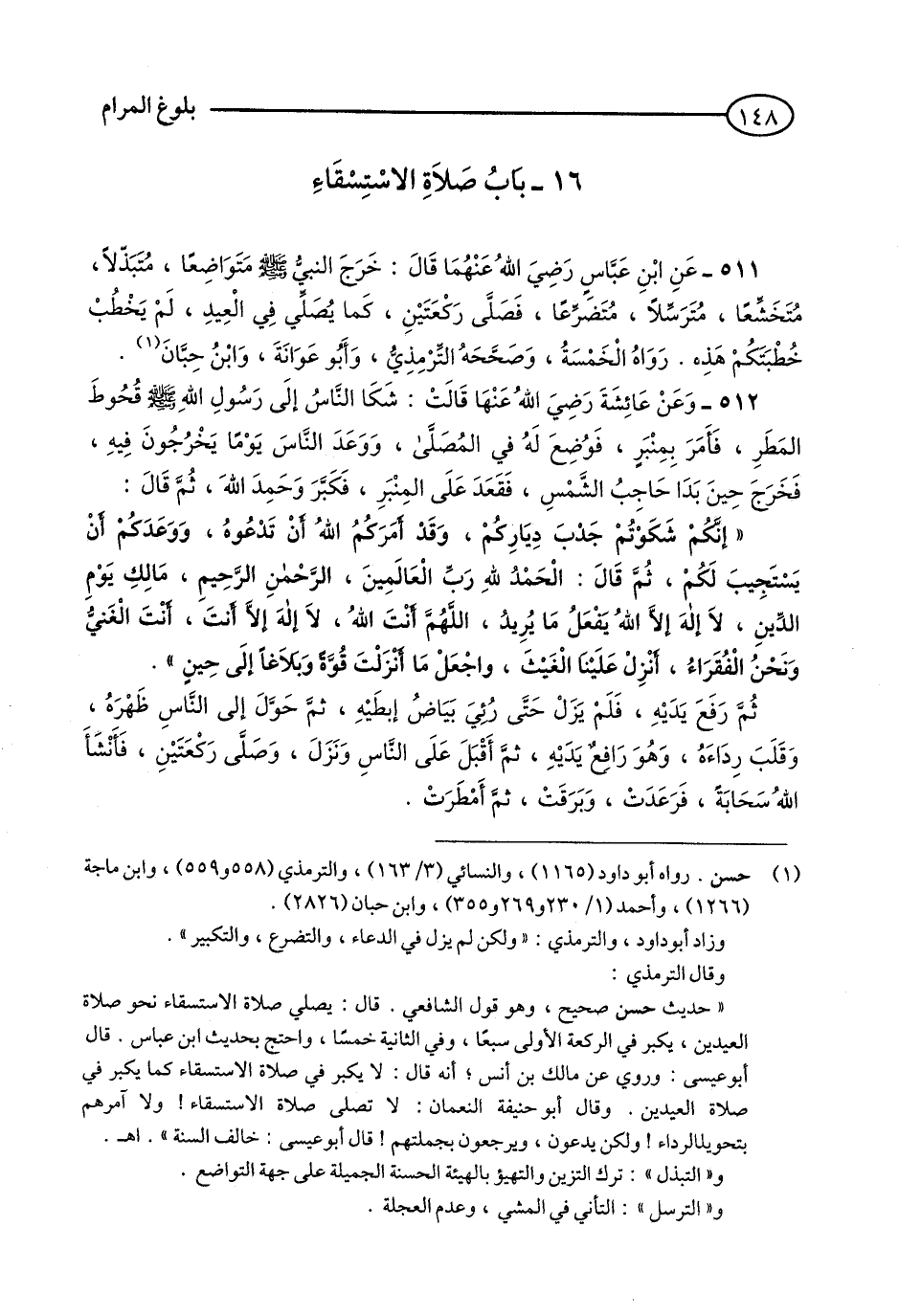 511 - عَنِ ابْنِ عَبَّاسٍ رَضِيَ اللَّهُ عَنْهُمَا قَالَ: خَرَجَ النَّبِيُّ - صلى الله عليه وسلم - مُتَوَاضِعًا, مُتَبَذِّلًا, مُتَخَشِّعًا, مُتَرَسِّلًا, مُتَضَرِّعًا, فَصَلَّى رَكْعَتَيْنِ, كَمَا يُصَلِّي فِي الْعِيدِ, لَمْ يَخْطُبْ خُطْبَتَكُمْ هَذِهِ. رَوَاهُ الْخَمْسَةُ, وَصَحَّحَهُ التِّرْمِذِيُّ, وَأَبُو عَوَانَةَ, وَابْنُ حِبَّانَ. (1)
