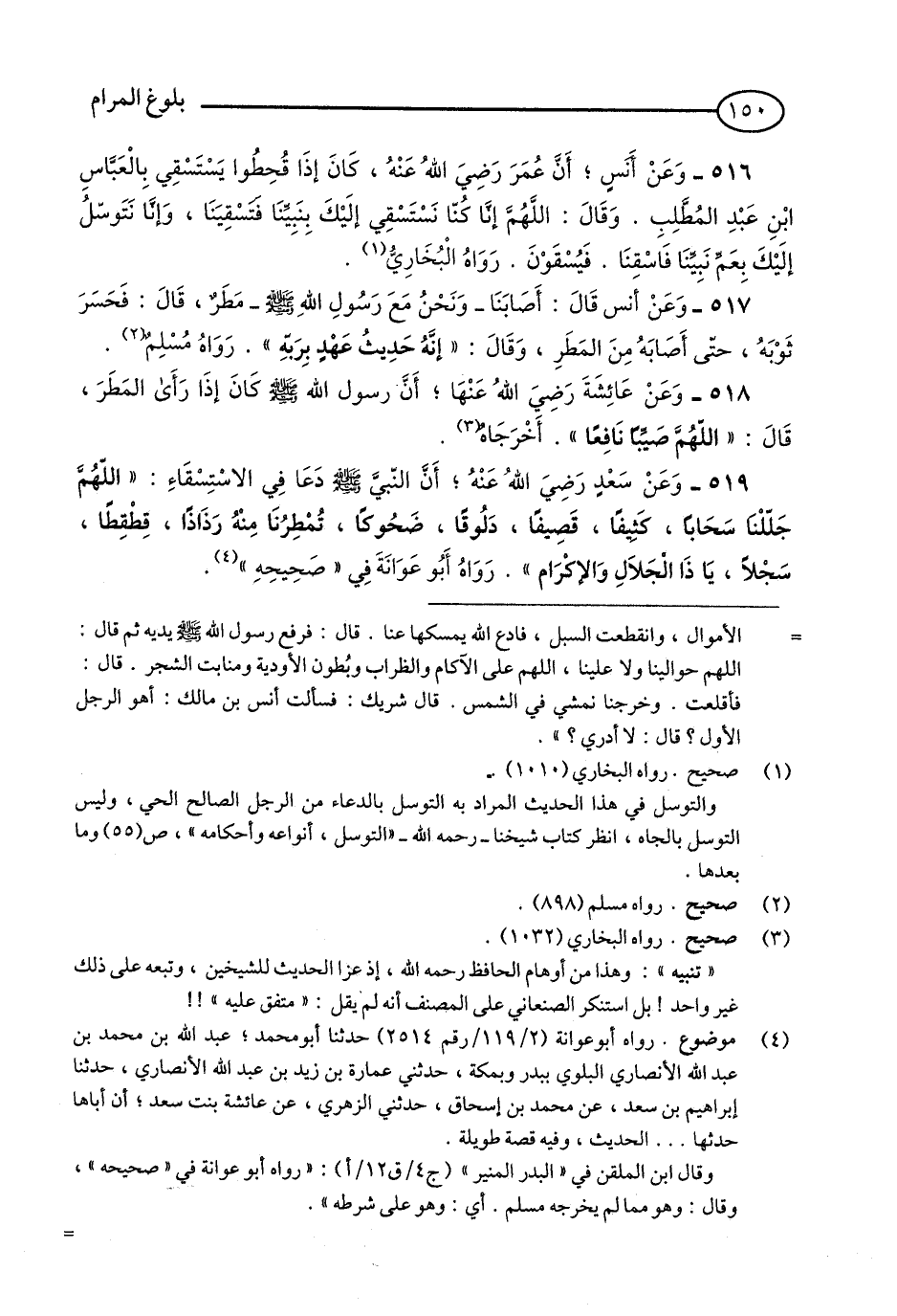 516 - وَعَنْ أَنَسٍ: أَنَّ عُمَرَ - رضي الله عنه - كَانَ إِذَا قَحِطُوا يَسْتَسْقِي بِالْعَبَّاسِ بْنِ عَبْدِ الْمُطَّلِبِ. وَقَالَ: اللَّهُمَّ إِنَّا كُنَّا نَسْتَسْقِي إِلَيْكَ بِنَبِيِّنَا فَتَسْقِينَا, وَإِنَّا نَتَوَسَّلُ إِلَيْكَ بِعَمِّ نَبِيِّنَا فَاسْقِنَا، فَيُسْقَوْنَ. رَوَاهُ الْبُخَارِيُّ. (1)