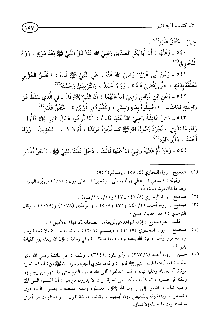 543 - وَعَنْ عَائِشَةَ رَضِيَ اللَّهُ عَنْهَا قَالَتْ: لَمَّا أَرَادُوا غَسْلَ النَّبِيِّ - صلى الله عليه وسلم - قَالُوا: وَاللَّهُ مَا نَدْرِي, نُجَرِّدُ رَسُولَ اللَّهِ - صلى الله عليه وسلم - كَمَا نُجَرِّدُ مَوْتَانَا, أَمْ لَا?… الْحَدِيثَ، رَوَاهُ أَحْمَدُ, وَأَبُو دَاوُدَ. (1)