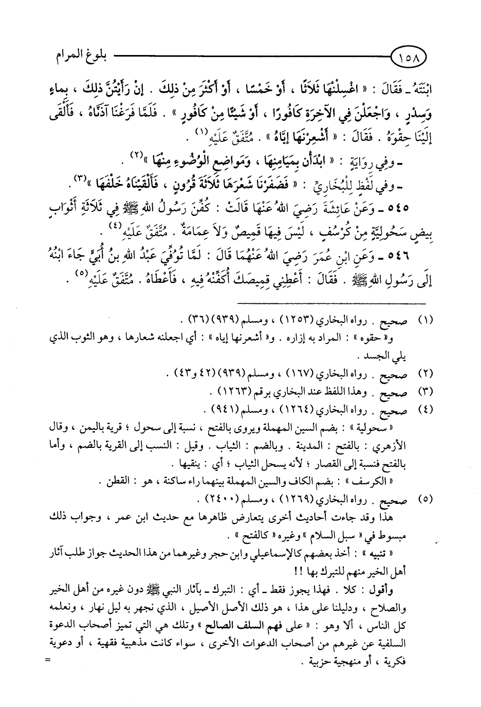 545 - وَعَنْ عَائِشَةَ رَضِيَ اللَّهُ عَنْهَا قَالَتْ: كُفِّنَ رَسُولُ اللَّهِ - صلى الله عليه وسلم - فِي ثَلَاثَةِ أَثْوَابٍ بِيضٍ سَحُولِيَّةٍ مِنْ كُرْسُفٍ, لَيْسَ فِيهَا قَمِيصٌ وَلَا عِمَامَةٌ. مُتَّفَقٌ عَلَيْهِ. (1)