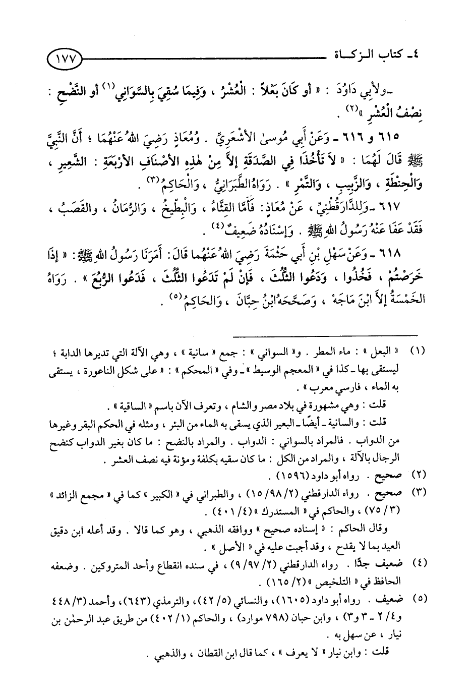 617 - وَلِلدَّارَقُطْنِيِّ, عَنْ مُعَاذٍ: فَأَمَّا الْقِثَّاءُ, وَالْبِطِّيخُ, وَالرُّمَّانُ, وَالْقَصَبُ, فَقَدْ عَفَا عَنْهُ رَسُولُ اللَّهِ - صلى الله عليه وسلم. وَإِسْنَادُهُ ضَعِيفٌ. (1)