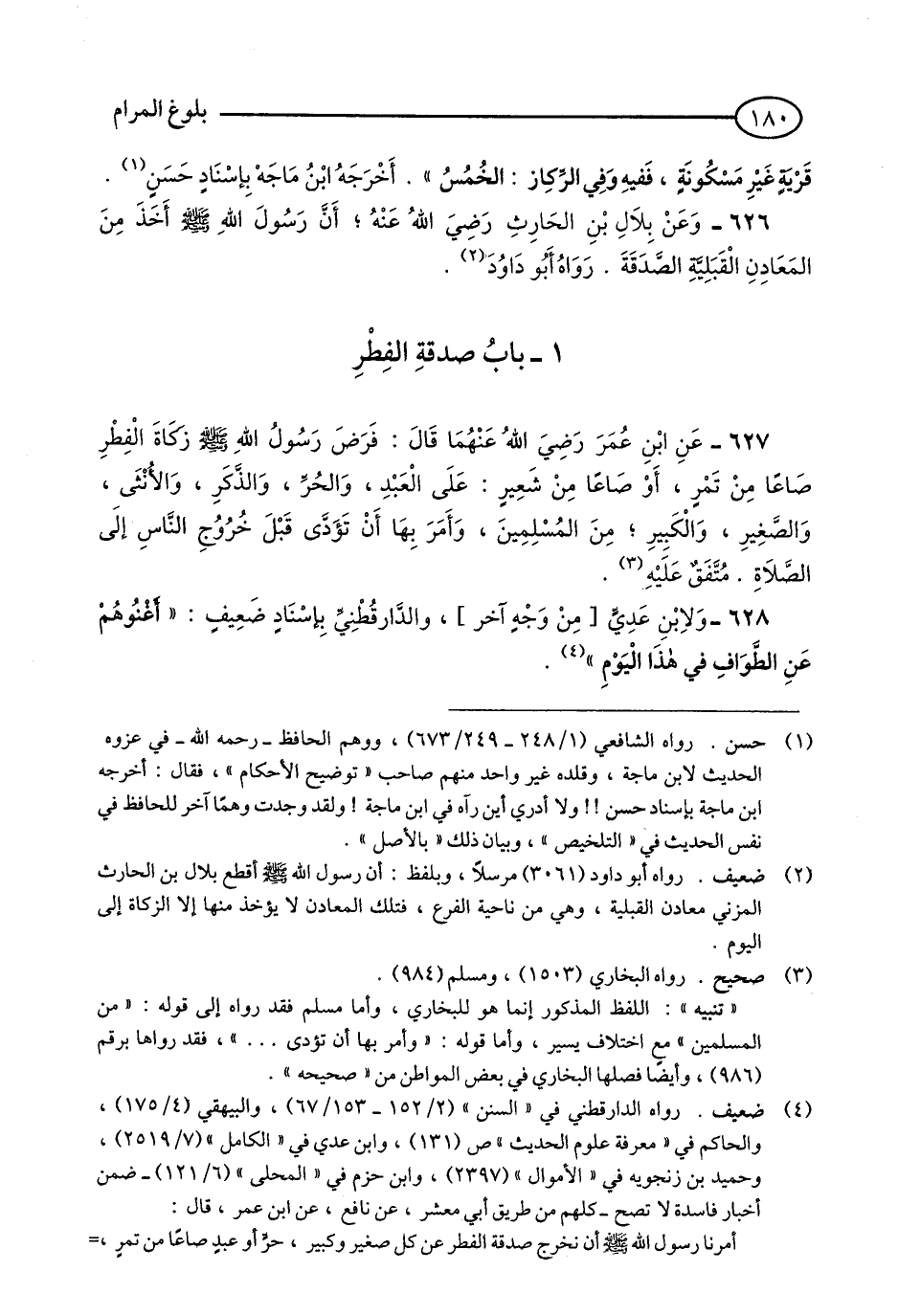 627 - عَنِ ابْنِ عُمَرَ رَضِيَ اللَّهُ عَنْهُمَا قَالَ: فَرَضَ رَسُولُ اللَّهِ - صلى الله عليه وسلم - زَكَاةَ الْفِطْرِ, صَاعًا مِنْ تَمْرٍ, أَوْ صَاعًا مِنْ شَعِيرٍ: عَلَى الْعَبْدِ وَالْحُرِّ, وَالذَّكَرِ, وَالْأُنْثَى, وَالصَّغِيرِ, وَالْكَبِيرِ, مِنَ الْمُسْلِمِينَ, وَأَمَرَ بِهَا أَنْ تُؤَدَّى قَبْلَ خُرُوجِ النَّاسِ إِلَى الصَّلَاةِ. مُتَّفَقٌ عَلَيْهِ. (1)