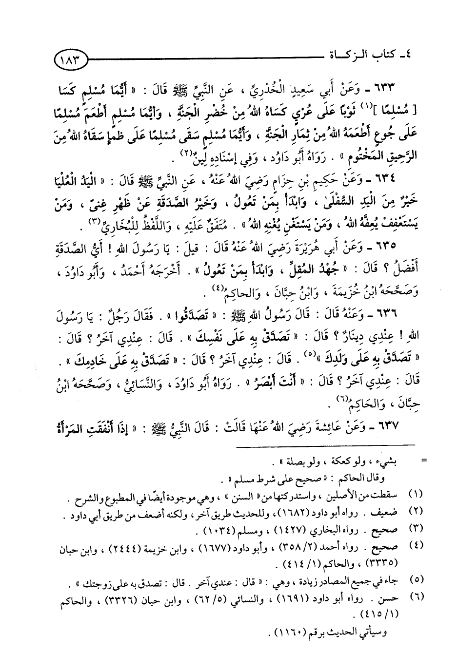 634 - وَعَنْ حَكِيمِ بْنِ حِزَامٍ - رضي الله عنه - عَنِ النَّبِيِّ - صلى الله عليه وسلم - قَالَ: «الْيَدُ الْعُلْيَا خَيْرٌ مِنَ الْيَدِ السُّفْلَى, وَابْدَأْ بِمَنْ تَعُولُ, وَخَيْرُ الصَّدَقَةِ عَنْ ظَهْرِ غِنًى, وَمَنْ يَسْتَعْفِفْ يُعِفَّهُ اللَّهُ, وَمَنْ يَسْتَغْنِ يُغْنِهِ اللَّهُ». مُتَّفَقٌ عَلَيْهِ, وَاللَّفْظُ لِلْبُخَارِيِّ. (1)