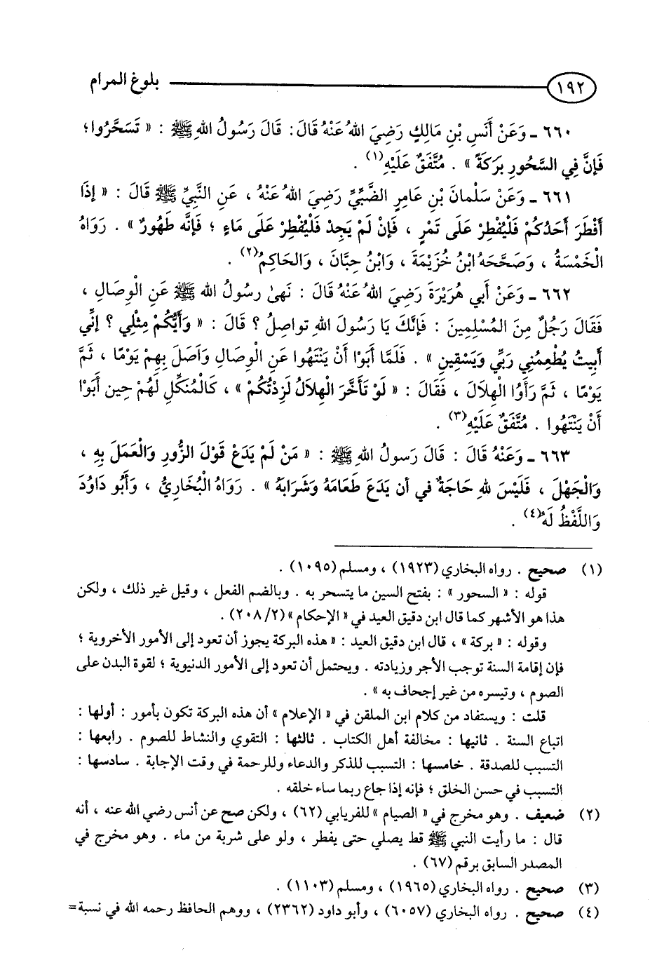 660 - وَعَنْ أَنَسِ بْنِ مَالِكٍ - رضي الله عنه - قَالَ: قَالَ رَسُولُ اللَّهِ - صلى الله عليه وسلم: «تَسَحَّرُوا فَإِنَّ فِي السَّحُورِ بَرَكَةً». مُتَّفَقٌ عَلَيْهِ. (1)