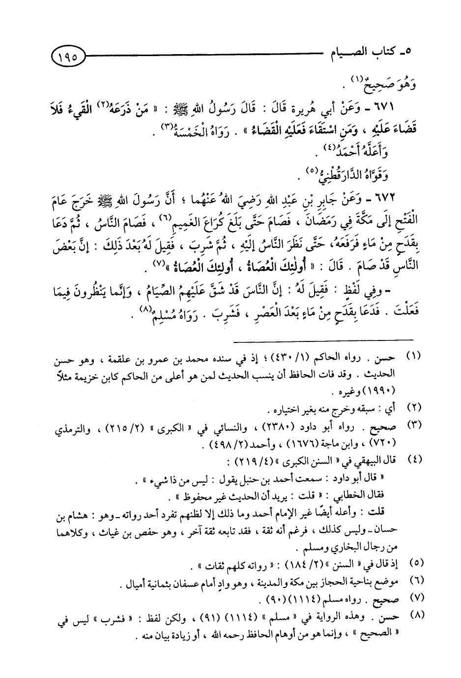 671 - وَعَنْ أَبِي هُرَيْرَةَ قَالَ: قَالَ رَسُولُ اللَّهِ - صلى الله عليه وسلم: «مَنْ ذَرَعَهُ الْقَيْءُ فَلَا قَضَاءَ عَلَيْهِ, وَمَنْ اسْتَقَاءَ فَعَلَيْهِ الْقَضَاءُ». رَوَاهُ الْخَمْسَةُ. (1)