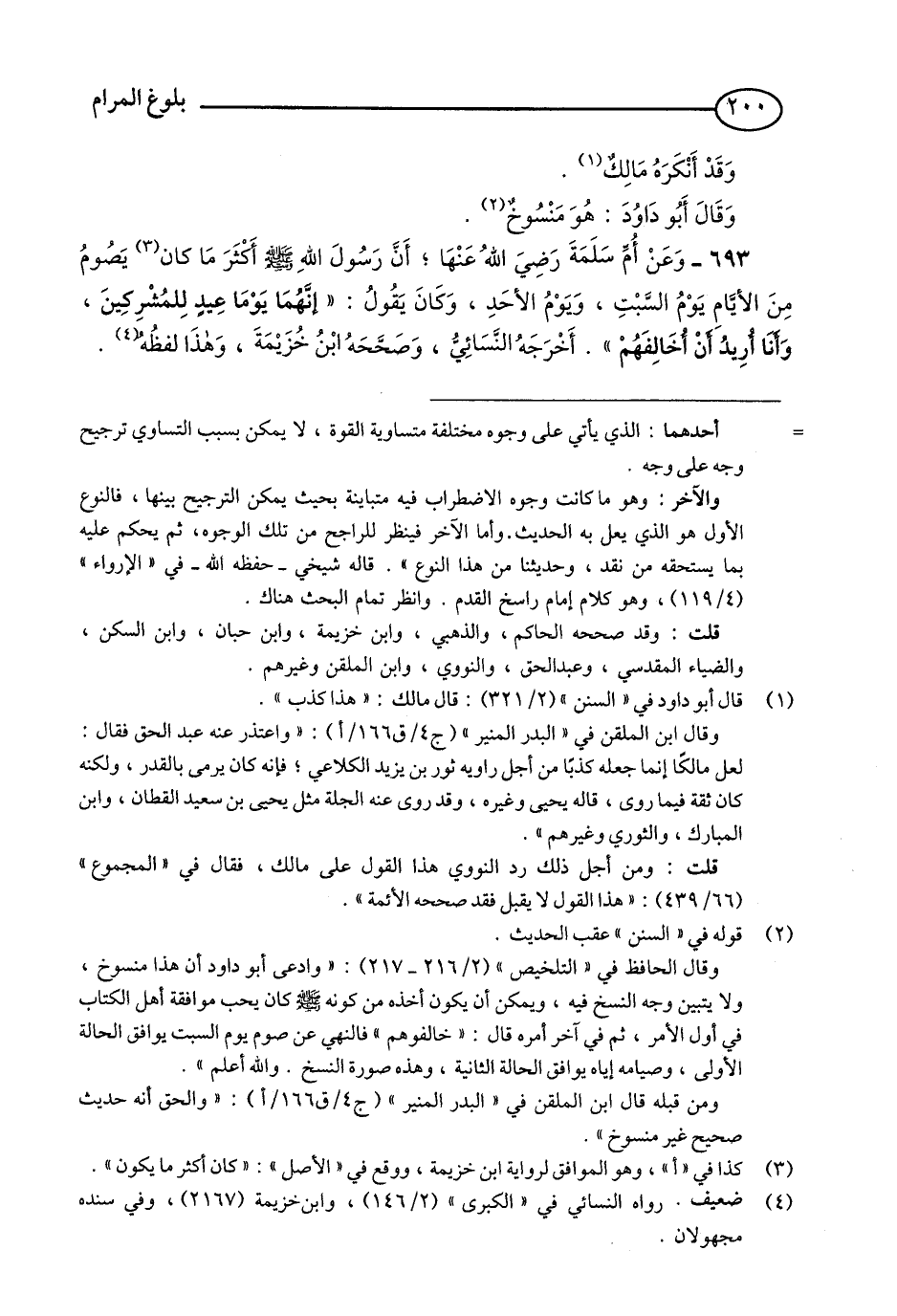 693 - وَعَنْ أُمِّ سَلَمَةَ رَضِيَ اللَّهُ عَنْهَا: أَنَّ رَسُولَ اللَّهِ - صلى الله عليه وسلم - كَانَ أَكْثَرَ مَا يَصُومُ مِنَ الْأَيَّامِ يَوْمُ السَّبْتِ, وَيَوْمُ الْأَحَدِ, وَكَانَ يَقُولُ: «إِنَّهُمَا يَوْمَا عِيدٍ لِلْمُشْرِكِينَ, وَأَنَا أُرِيدُ أَنْ أُخَالِفَهُمْ». أَخْرَجَهُ النَّسَائِيُّ, وَصَحَّحَهُ ابْنُ خُزَيْمَةَ, وَهَذَا لَفْظُهُ. (1)