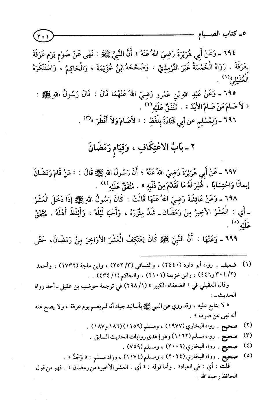 694 - وَعَنْ أَبِي هُرَيْرَةَ - رضي الله عنه: أَنَّ النَّبِيَّ - صلى الله عليه وسلم - نَهَى عَنْ صَوْمِ يَوْمِ عَرَفَةَ بِعَرَفَةَ. رَوَاهُ الْخَمْسَةُ غَيْرَ التِّرْمِذِيِّ, وَصَحَّحَهُ ابْنُ خُزَيْمَةَ, وَالْحَاكِمُ, وَاسْتَنْكَرَهُ الْعُقَيْلِيُّ. (1)