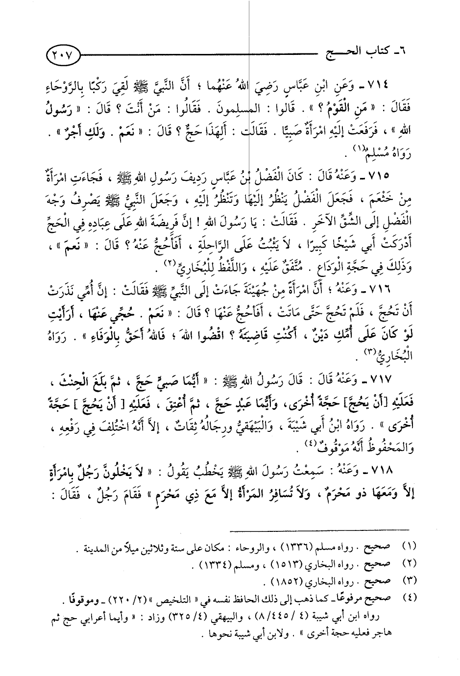 714 - وَعَنِ ابْنِ عَبَّاسٍ رَضِيَ اللَّهُ عَنْهُمَا: أَنَّ النَّبِيَّ - صلى الله عليه وسلم - لَقِيَ رَكْبًا بِالرَّوْحَاءِ فَقَالَ: «مَنِ الْقَوْمُ?» قَالُوا: الْمُسْلِمُونَ. فَقَالُوا: مَنْ أَنْتَ? قَالَ: «رَسُولُ اللَّهِ - صلى الله عليه وسلم» فَرَفَعَتْ إِلَيْهِ امْرَأَةٌ صَبِيًّا. فَقَالَتْ: أَلِهَذَا حَجٌّ? قَالَ: «نَعَمْ، وَلَكِ أَجْرٌ». رَوَاهُ مُسْلِمٌ. (1)