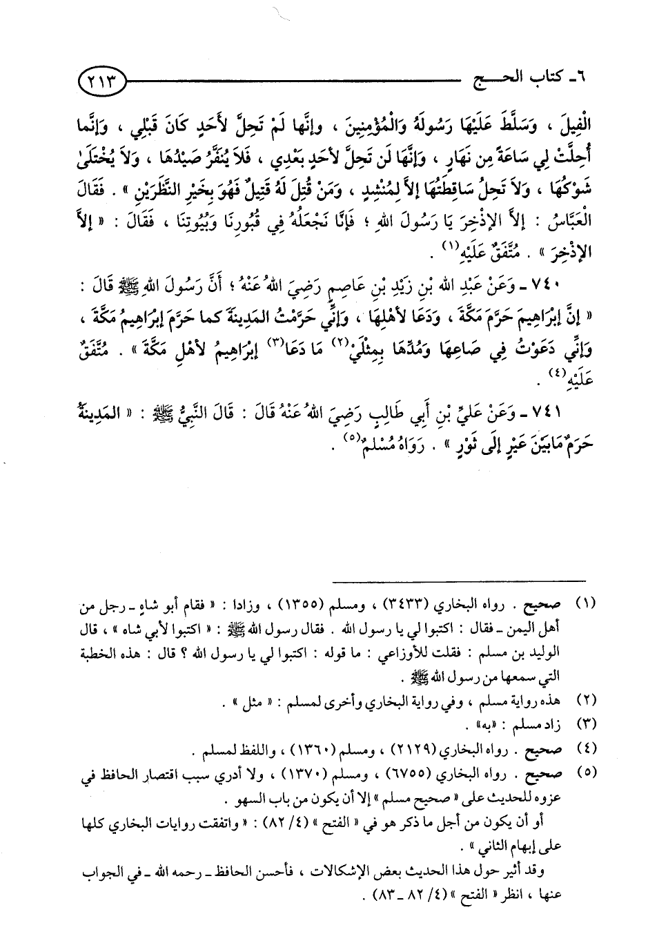 741 - وَعَنْ عَلِيِّ بْنِ أَبِي طَالِبٍ - رضي الله عنه - قَالَ: قَالَ رَسُولُ اللَّهِ - صلى الله عليه وسلم: «الْمَدِينَةُ حَرَمٌ مَا بَيْنَ عَيْرٍ إِلَى ثَوْرٍ». رَوَاهُ مُسْلِمٌ. (1)