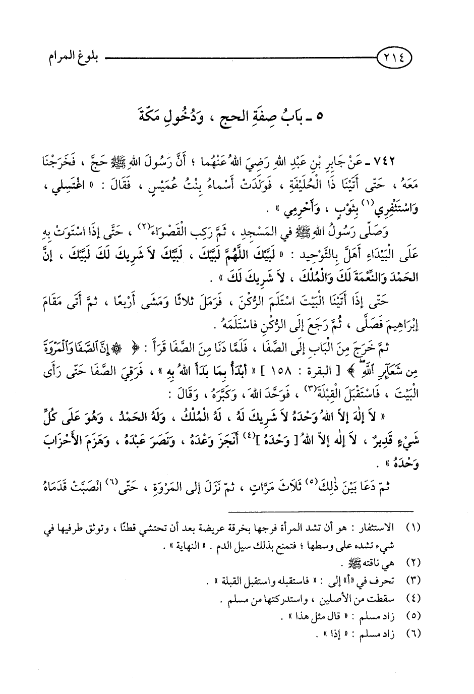 742 - وَعَنْ جَابِرِ بْنِ عَبْدِ اللَّهِ رَضِيَ اللَّهُ عَنْهُمَا: أَنَّ رَسُولَ اللَّهِ - صلى الله عليه وسلم - حَجَّ, فَخَرَجْنَا مَعَهُ, حَتَّى أَتَيْنَا ذَا الْحُلَيْفَةِ, فَوَلَدَتْ أَسْمَاءُ بِنْتُ عُمَيْسٍ, فَقَالَ: «اغْتَسِلِي وَاسْتَثْفِرِي بِثَوْبٍ, وَأَحْرِمِي».