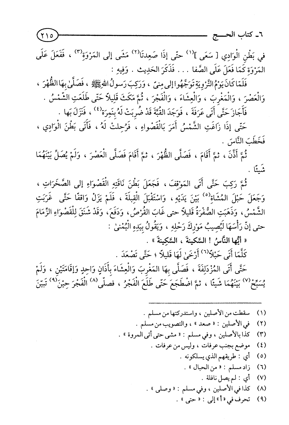 ثُمَّ رَكِبَ حَتَّى أَتَى الْمَوْقِفَ فَجَعَلَ بَطْنَ نَاقَتِهِ الْقَصْوَاءِ إِلَى الصَّخَرَاتِ, وَجَعَلَ حَبْلَ الْمُشَاةِ (5) بَيْنَ يَدَيْهِ وَاسْتَقْبَلَ الْقِبْلَةَ, فَلَمْ يَزَلْ وَاقِفًا حَتَّى غَرَبَتِ الشَّمْسُ, وَذَهَبَتْ الصُّفْرَةُ قَلِيلًا, حَتَّى غَابَ الْقُرْصُ, وَدَفَعَ, وَقَدْ شَنَقَ لِلْقَصْوَاءِ الزِّمَامَ حَتَّى إِنَّ رَأْسَهَا لَيُصِيبُ مَوْرِكَ رَحْلِهِ, وَيَقُولُ بِيَدِهِ الْيُمْنَى: «أَيُّهَا النَّاسُ, السَّكِينَةَ, السَّكِينَةَ» , كُلَّمَا أَتَى حَبْلًا (6) أَرْخَى لَهَا قَلِيلًا حَتَّى تَصْعَدَ.