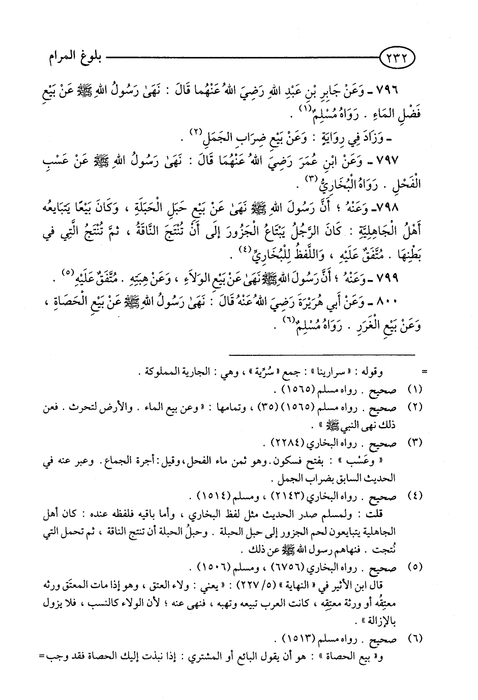 796 - وَعَنْ جَابِرِ بْنِ عَبْدِ اللَّهِ -رَضِيَ اللَّهُ عَنْهُمَا- قَالَ: نَهَى النَّبِيُّ - صلى الله عليه وسلم - عَنْ بَيْعِ فَضْلِ الْمَاءِ. رَوَاهُ مُسْلِمٌ. (1)